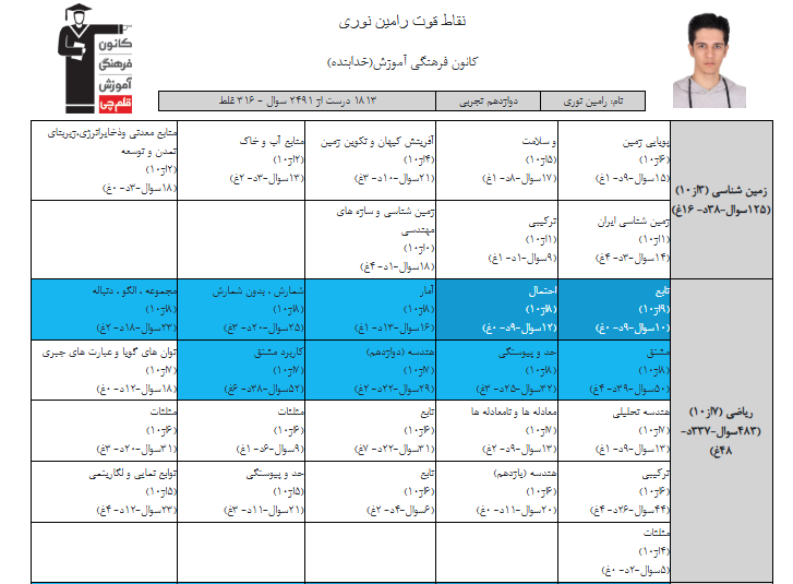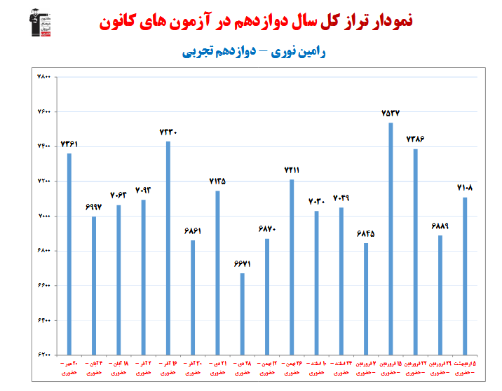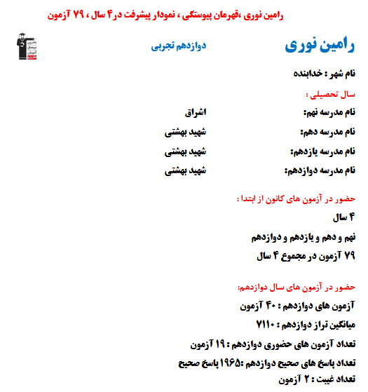 در ادامه میتوانید عملکرد درسی رامین نوری را در کانون مشاهده کنید. نمودار پیشرفت میانگین تراز در پایههای مختلف، نمودار تراز کل، عملکرد آزمونهای سال دوازدهم، کارنامههای مبحثی در نمودارها و تصاویر زیر قابل مشاهده است.