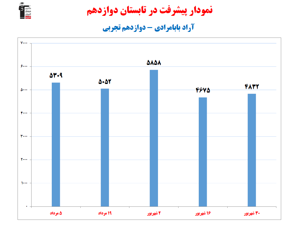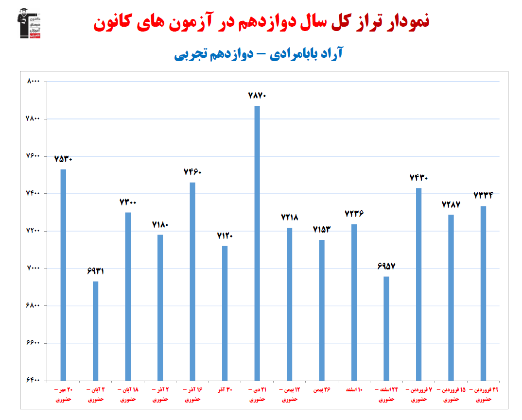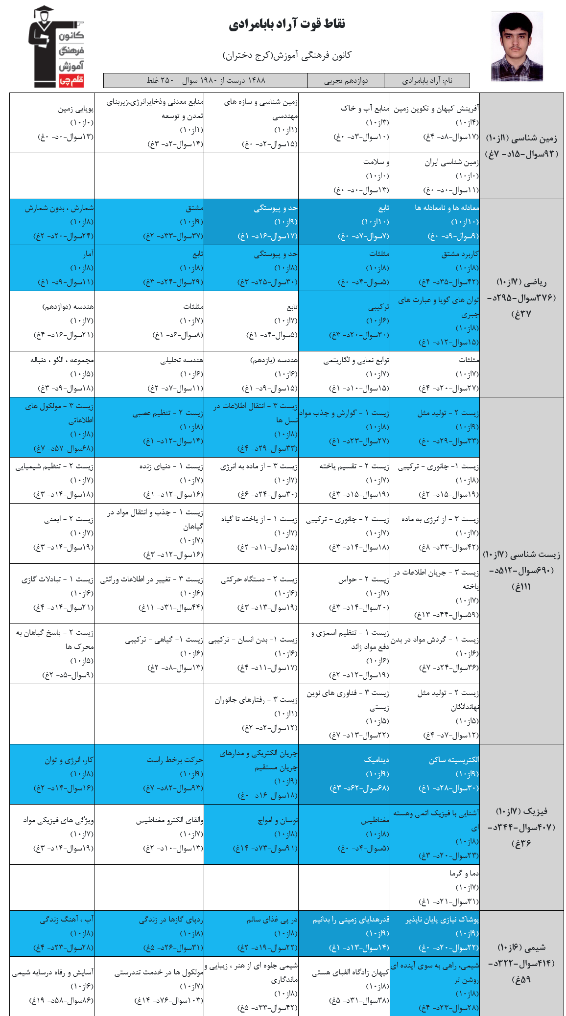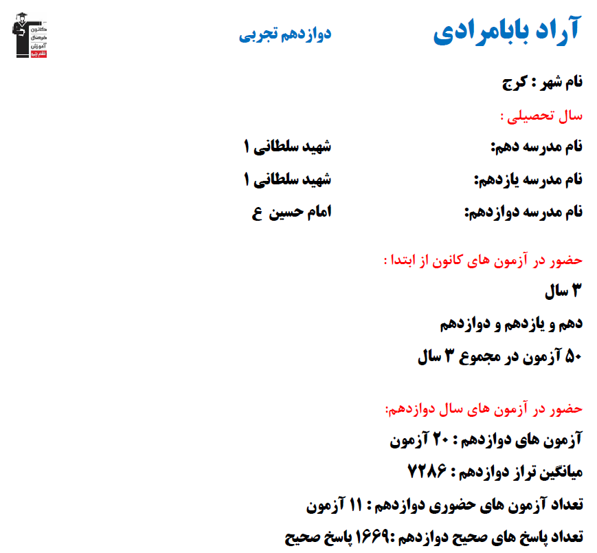 در ادامه میتوانید عملکرد درسی آراد بابامرادي را در کانون مشاهده کنید.نمودار پیشرفت میانگین تراز در پایههای مختلف، نمودار تراز کل، عملکرد آزمونهای سال دوازدهم و شروع از تابستان و تراز آزمون های تابستان، کارنامههای مبحثی در نمودارها و تصاویر زیر قابل مشاهده است.