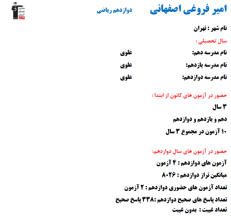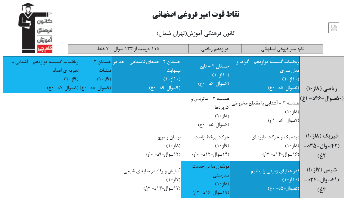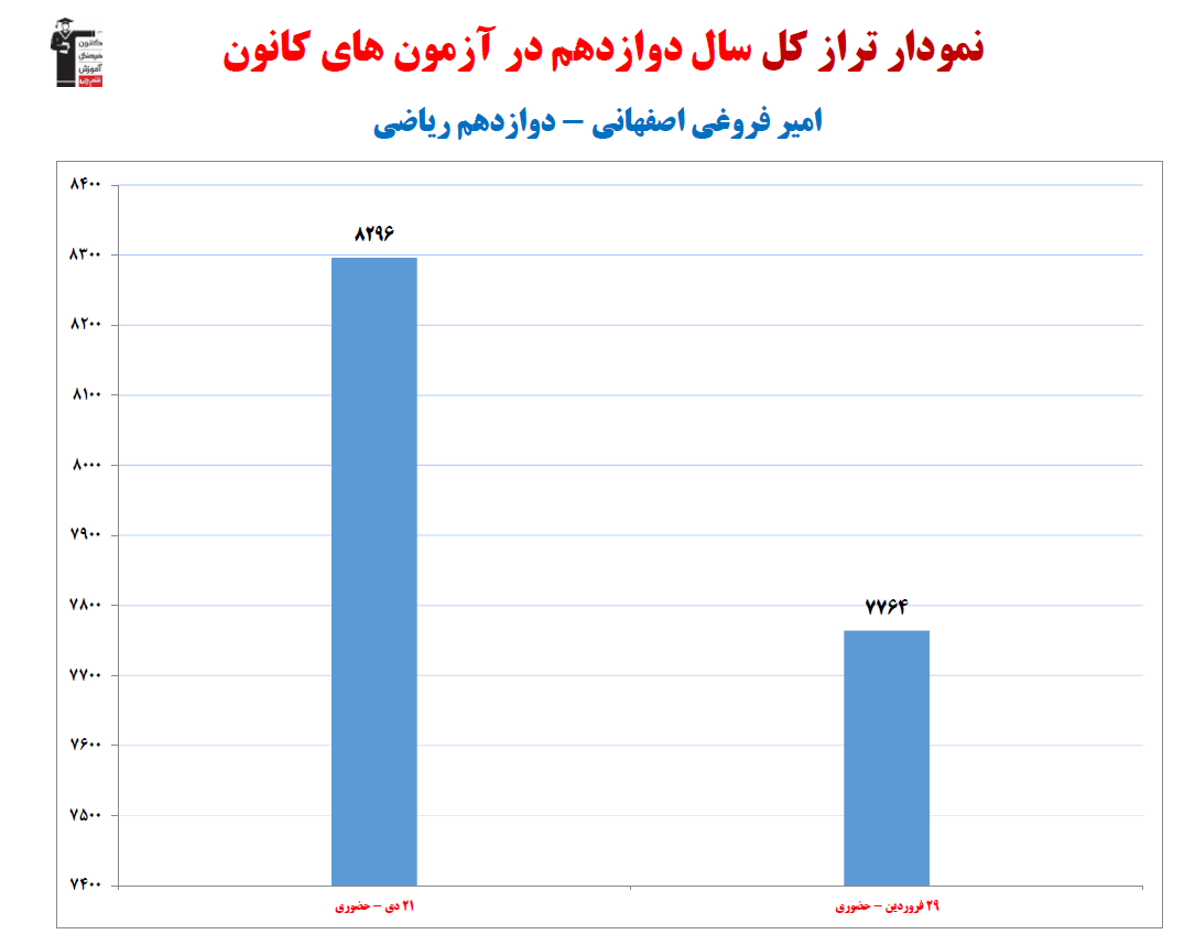در ادامه میتوانید عملکرد درسی امير فروغي اصفهانی را در کانون مشاهده کنید.نمودار پیشرفت میانگین تراز در پایههای مختلف، نمودار تراز کل، عملکرد آزمونهای سال دوازدهم و شروع از تابستان و تراز آزمون های تابستان، کارنامههای مبحثی در نمودارها و تصاویر زیر قابل مشاهده است.