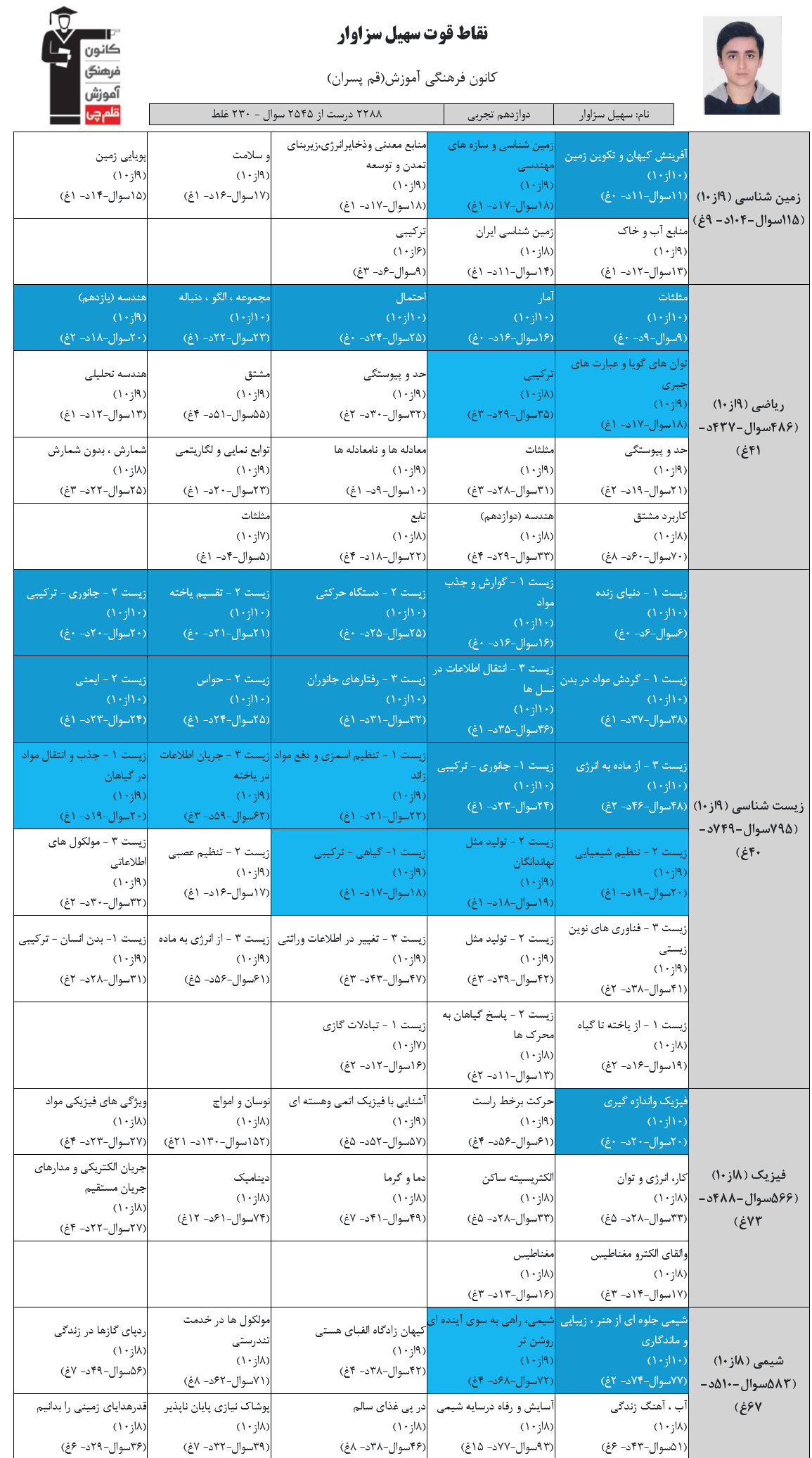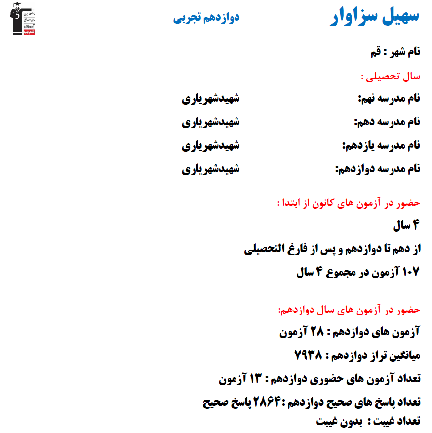 در ادامه میتوانید عملکرد درسی سهيل سزاوار را در کانون مشاهده کنید.نمودار پیشرفت میانگین تراز در پایههای مختلف، نمودار تراز کل، عملکرد آزمونهای سال دوازدهم و کارنامههای مبحثی در نمودارها و تصاویر زیر قابل مشاهده است.
