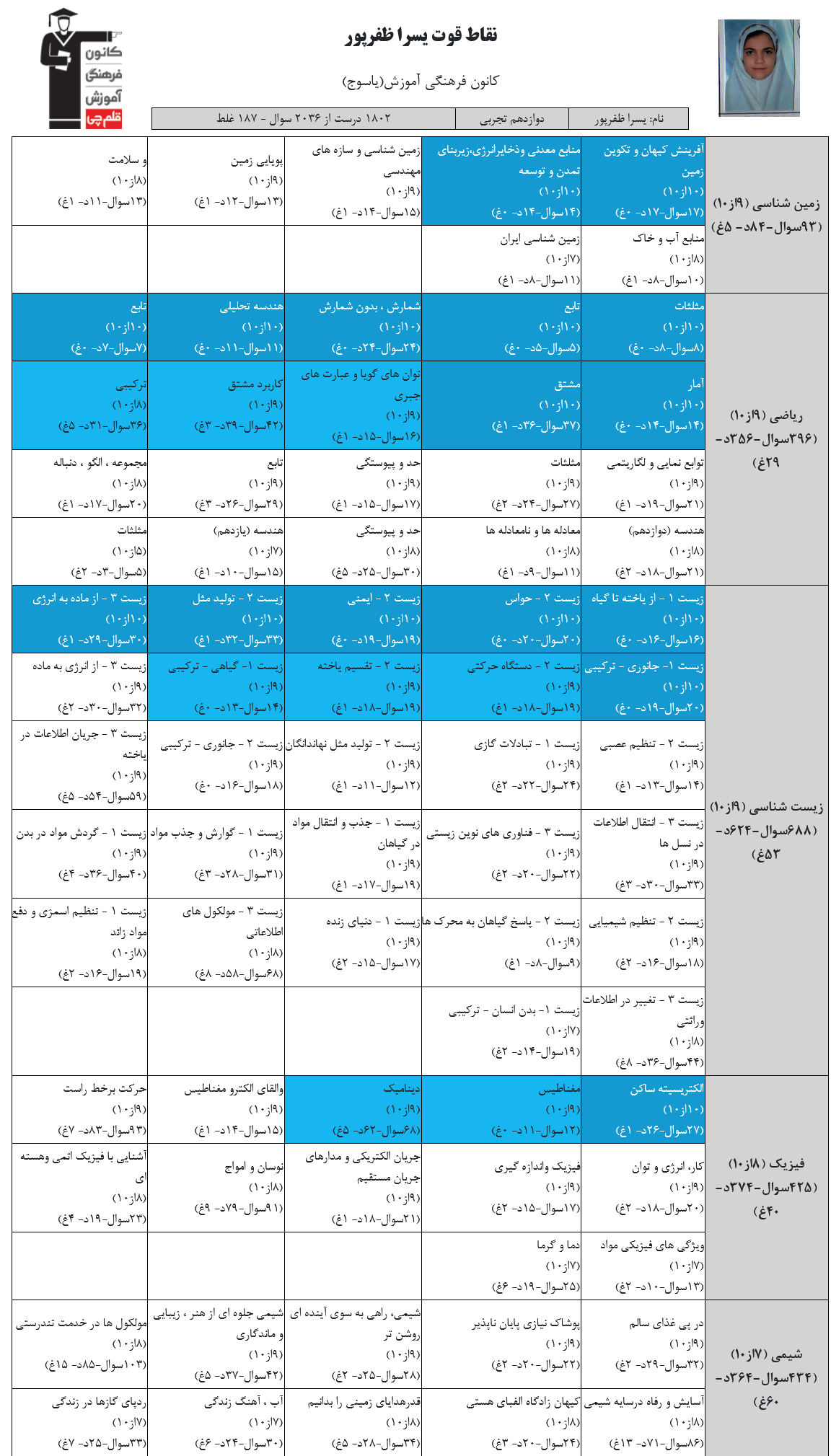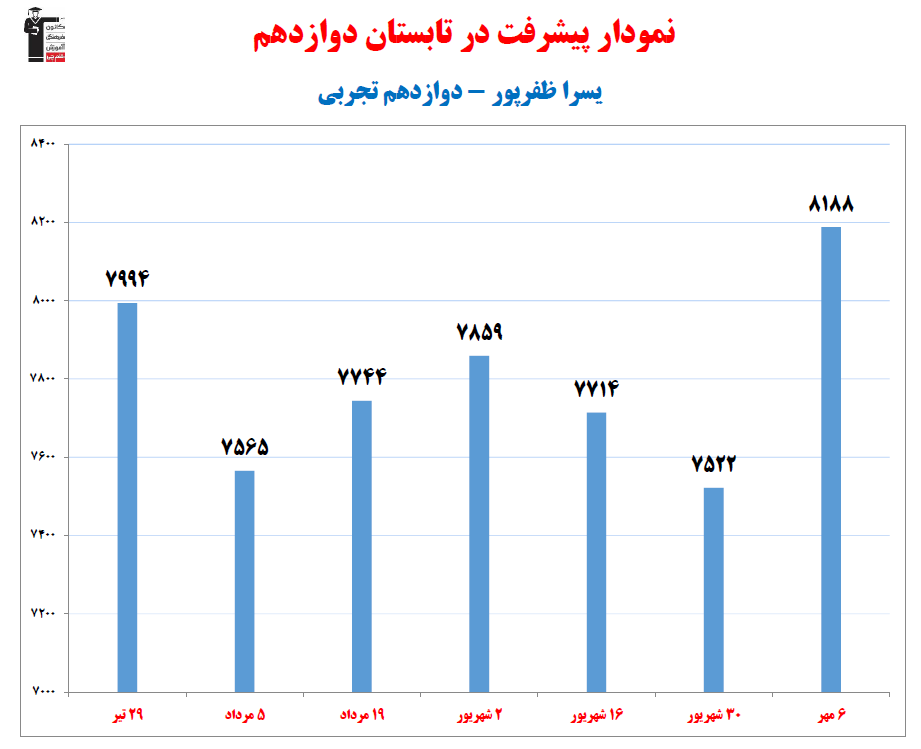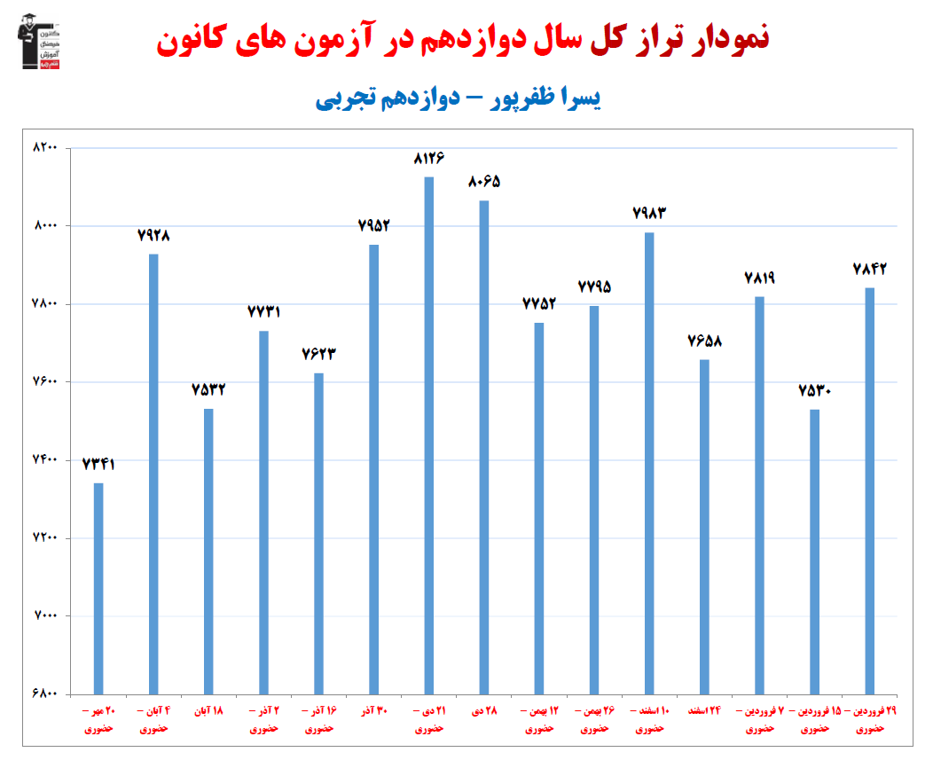 در ادامه میتوانید عملکرد درسی يسرا ظفرپور را در کانون مشاهده کنید.نمودار پیشرفت میانگین تراز در پایههای مختلف، نمودار تراز کل، عملکرد آزمونهای سال دوازدهم و شروع از تابستان و تراز آزمون های تابستان، کارنامههای مبحثی در نمودارها و تصاویر زیر قابل مشاهده است.