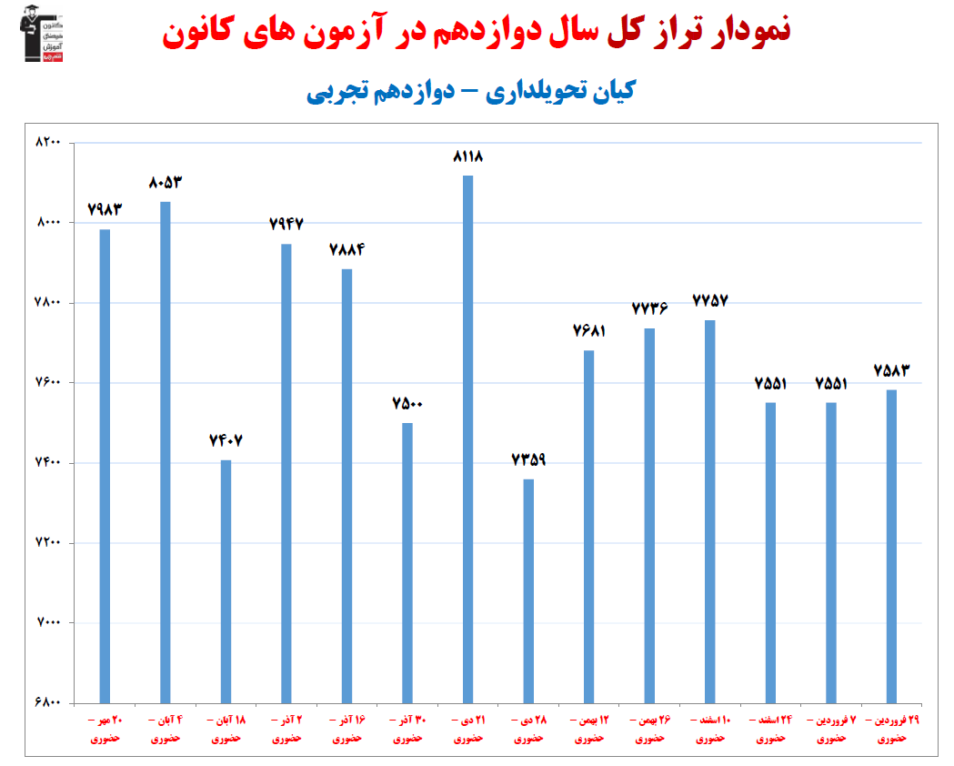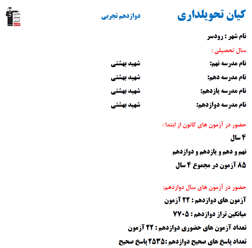 در ادامه میتوانید عملکرد درسی کيان تحويلداري را در کانون مشاهده کنید.نمودار پیشرفت میانگین تراز در پایههای مختلف، نمودار تراز کل، عملکرد آزمونهای سال دوازدهم و شروع از تابستان و تراز آزمون های تابستان، کارنامههای مبحثی در نمودارها و تصاویر زیر قابل مشاهده است.