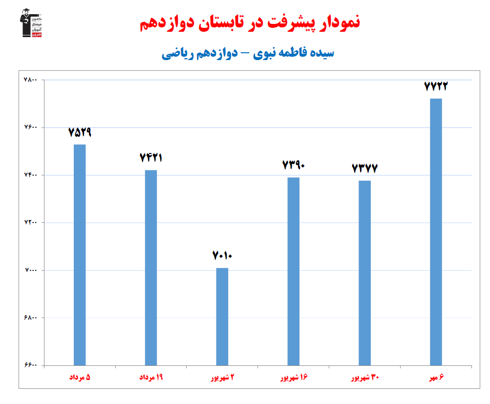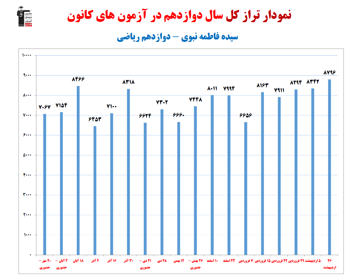 نمودار پیشرفت میانگین تراز در پایههای مختلف، نمودار تراز کل، عملکرد آزمونهای سال دوازدهم و شروع از تابستان و تراز آزمون های تابستان، کارنامههای مبحثی در نمودارها و تصاویر زیر قابل مشاهده است.