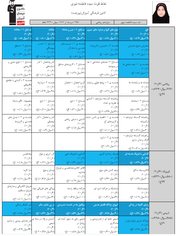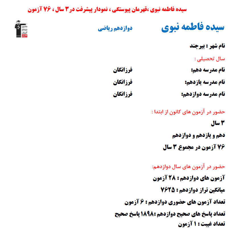 در ادامه میتوانید عملکرد درسی سیده فاطمه نبوی را در کانون مشاهده کنید.