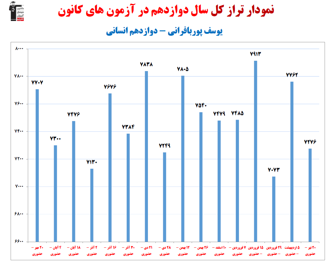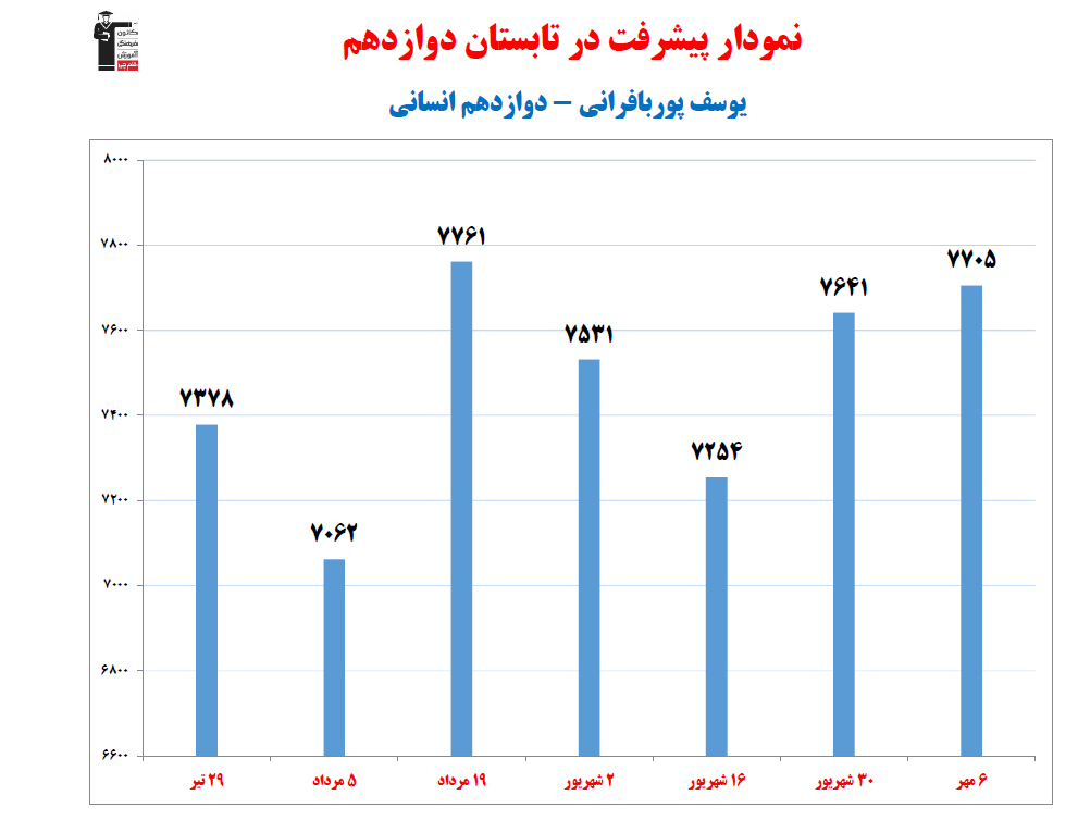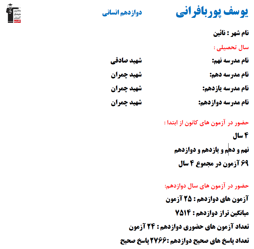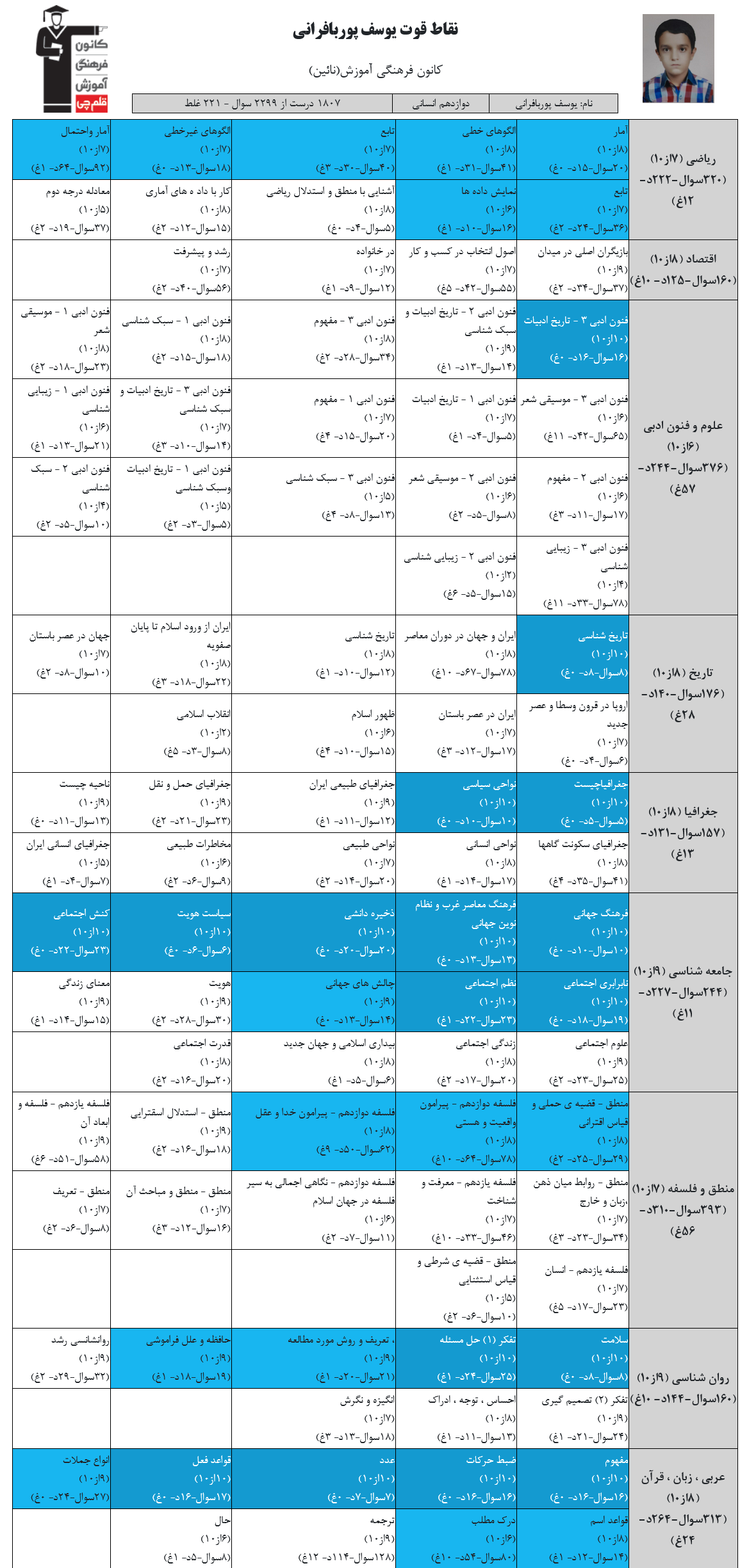 در ادامه میتوانید عملکرد درسی يوسف پوربافرانی را در کانون مشاهده کنید.نمودار پیشرفت میانگین تراز در پایههای مختلف، نمودار تراز کل، عملکرد آزمونهای سال دوازدهم و شروع از تابستان و تراز آزمون های تابستان، کارنامههای مبحثی در نمودارها و تصاویر زیر قابل مشاهده است.