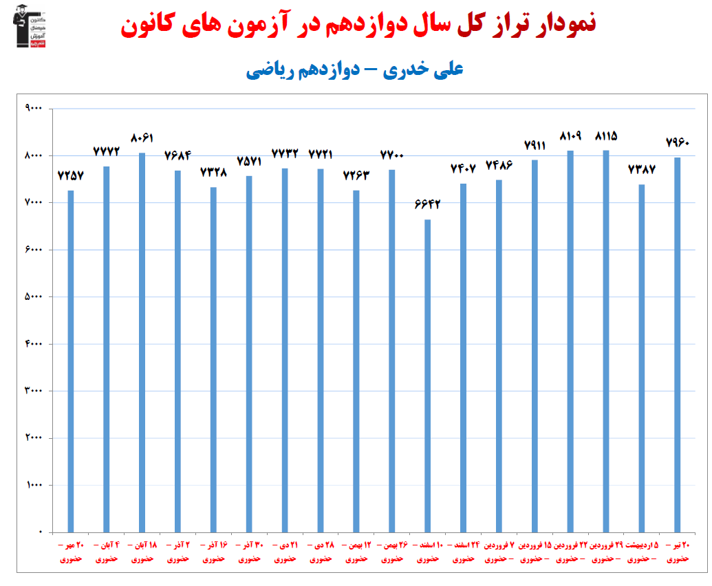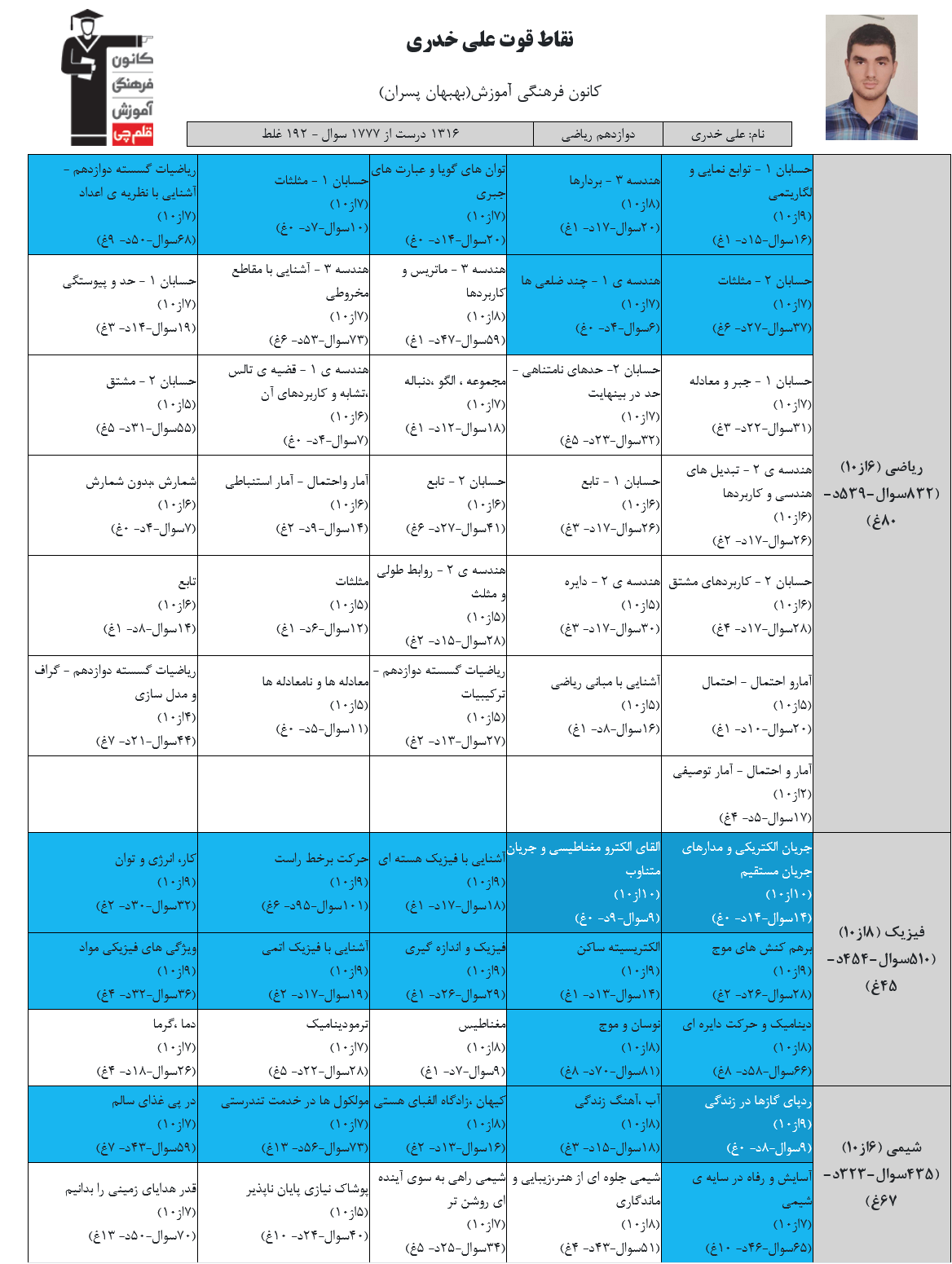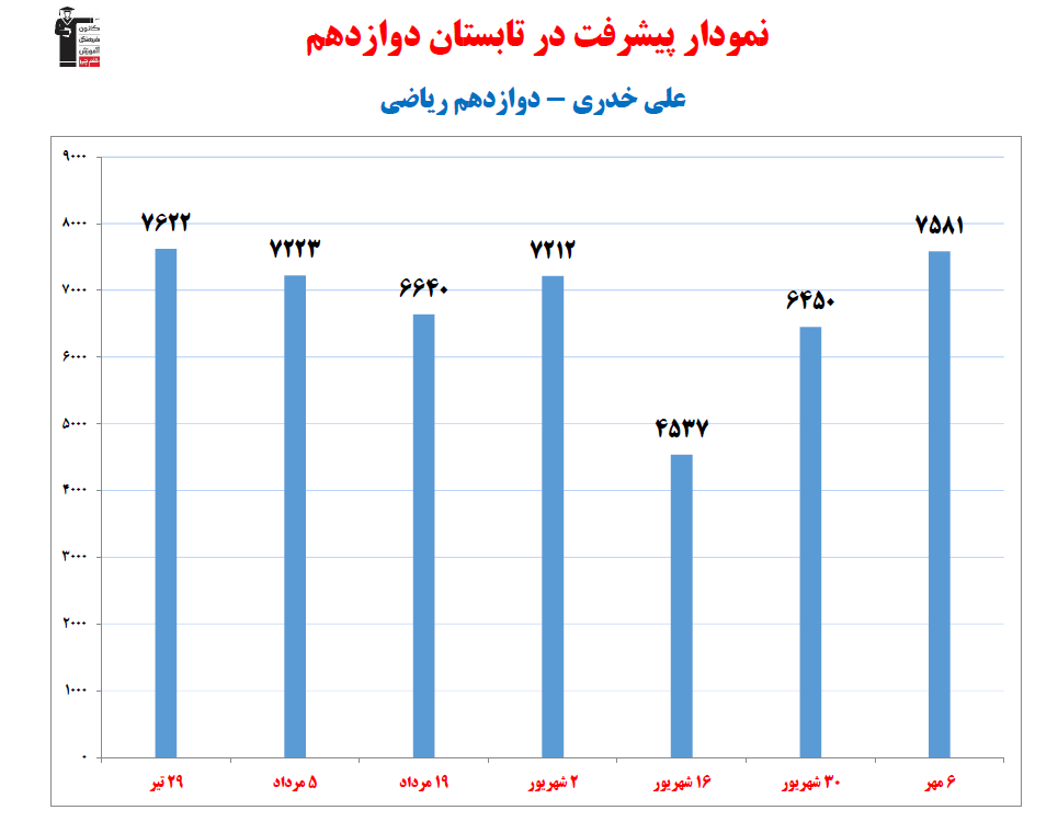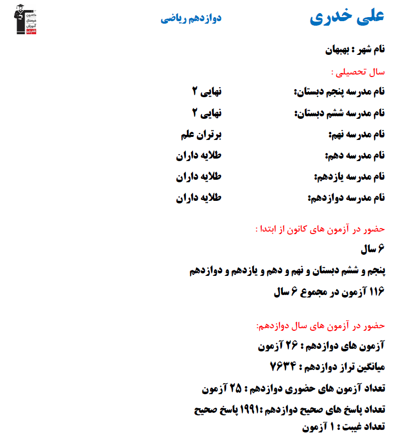در ادامه میتوانید عملکرد درسی علي خدري را در کانون مشاهده کنید.نمودار پیشرفت میانگین تراز در پایههای مختلف، نمودار تراز کل، عملکرد آزمونهای سال دوازدهم و شروع از تابستان و تراز آزمون های تابستان، کارنامههای مبحثی در نمودارها و تصاویر زیر قابل مشاهده است.