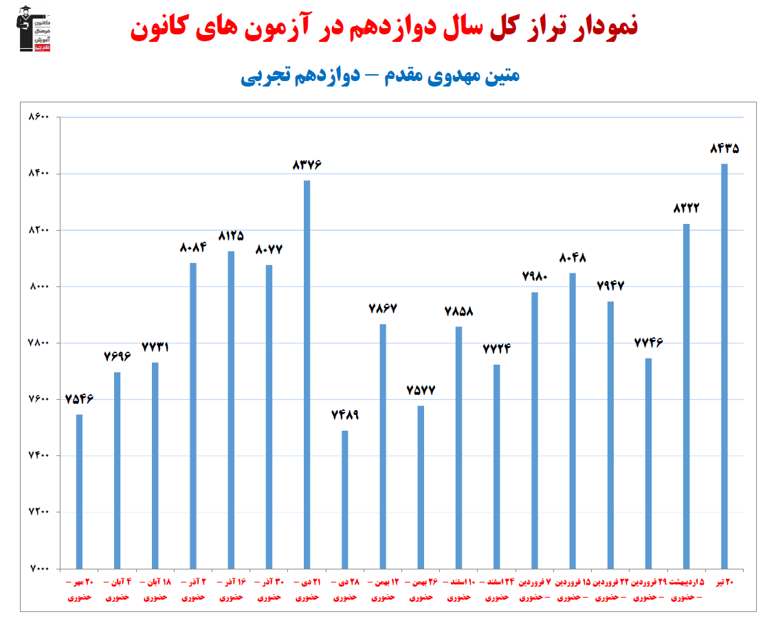 نمودار پیشرفت میانگین تراز در پایههای مختلف، نمودار تراز کل، عملکرد آزمونهای سال دوازدهم و شروع از تابستان و تراز آزمون های تابستان، کارنامههای مبحثی در نمودارها و تصاویر زیر قابل مشاهده است.
