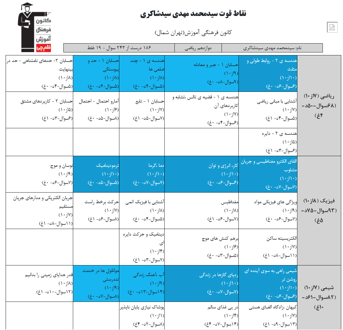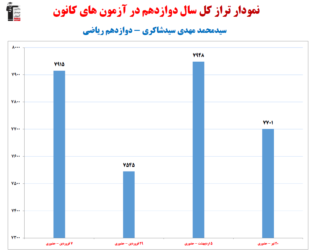 در ادامه میتوانید عملکرد درسی سيدمحمد مهدي سيدشاکري را در کانون مشاهده کنید.نمودار پیشرفت میانگین تراز در پایههای مختلف، نمودار تراز کل، عملکرد آزمونهای سال دوازدهم و کارنامههای مبحثی در نمودارها و تصاویر زیر قابل مشاهده است.
