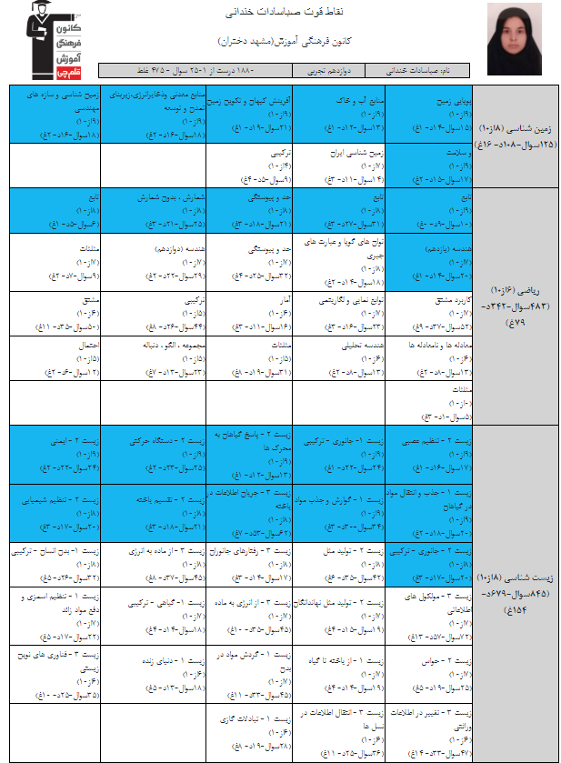 در ادامه میتوانید عملکرد درسی صبا سادات خندانی را در کانون مشاهده کنید.