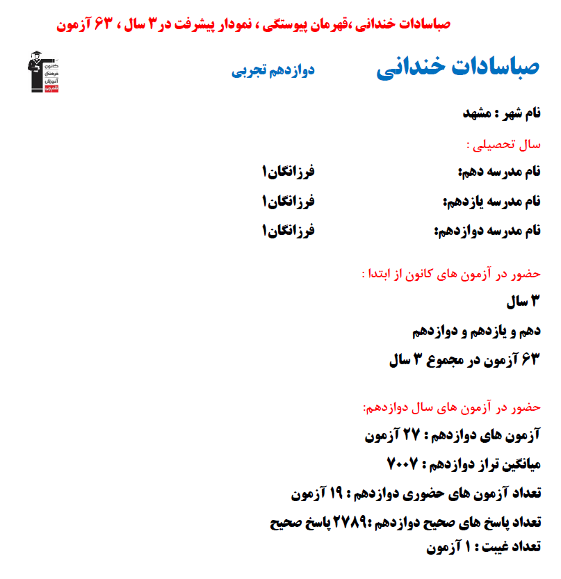 نمودار پیشرفت میانگین تراز در پایههای مختلف، نمودار تراز کل، عملکرد آزمونهای سال دوازدهم و شروع از تابستان و تراز آزمون های تابستان، کارنامههای مبحثی در نمودارها و تصاویر زیر قابل مشاهده است.