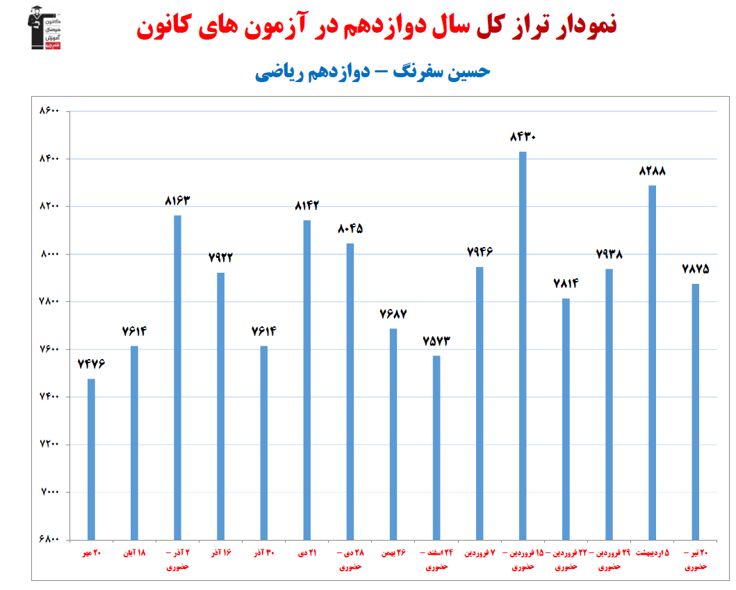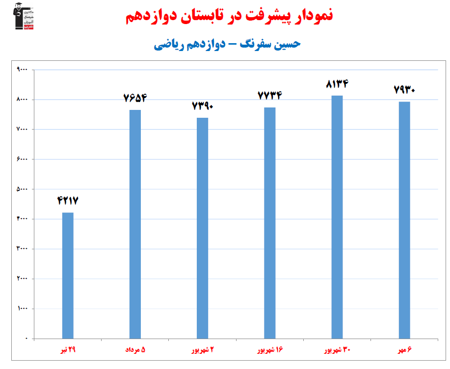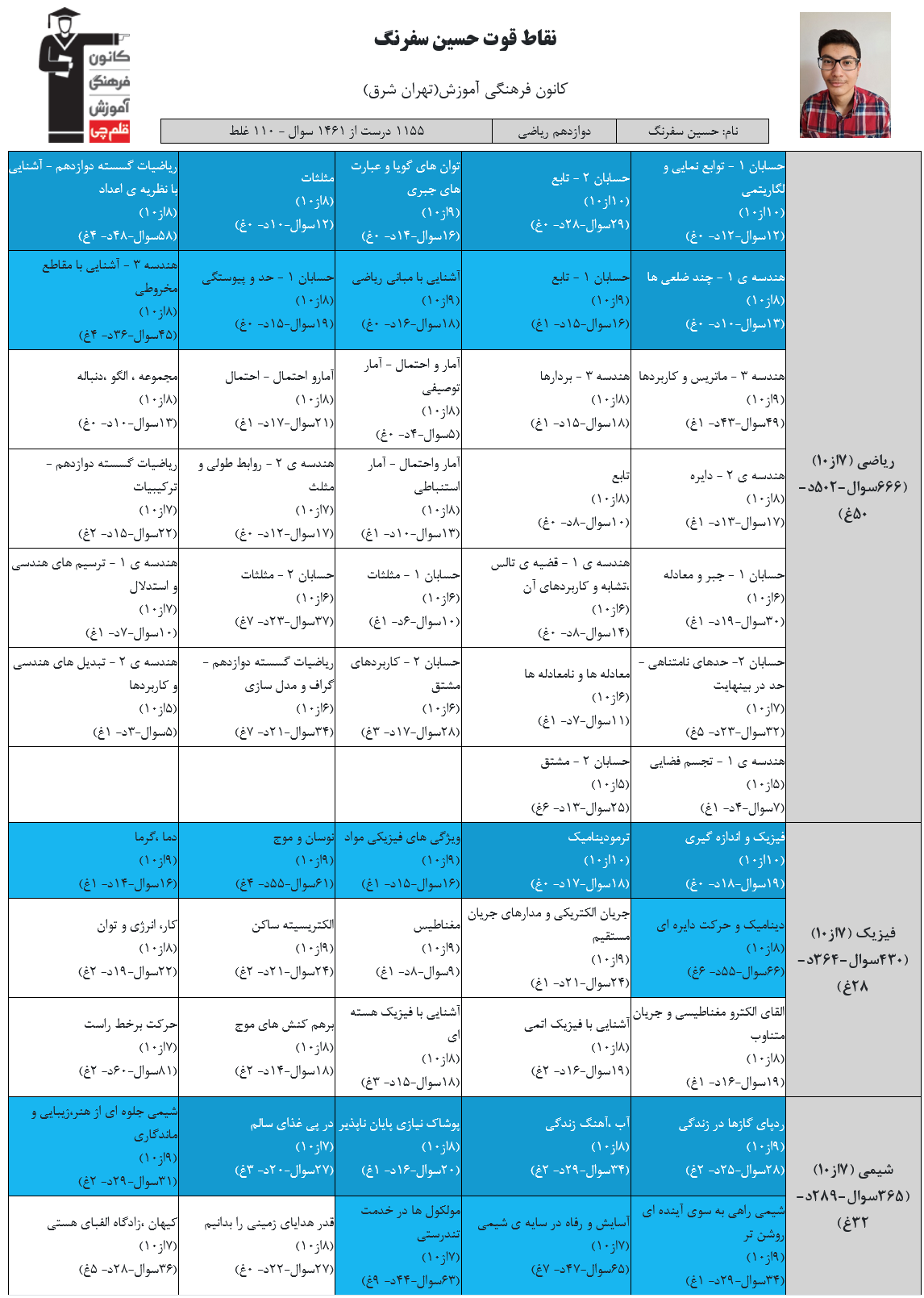 در ادامه میتوانید عملکرد درسی حسين سفرنگ را در کانون مشاهده کنید.نمودار پیشرفت میانگین تراز در پایههای مختلف، نمودار تراز کل، عملکرد آزمونهای سال دوازدهم و شروع از تابستان و تراز آزمون های تابستان، کارنامههای مبحثی در نمودارها و تصاویر زیر قابل مشاهده است.