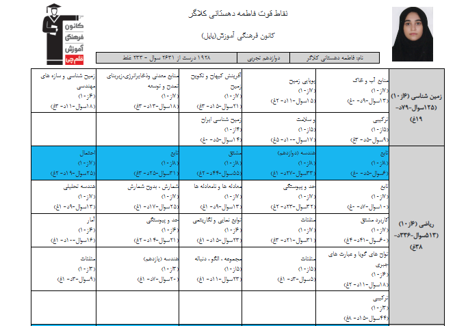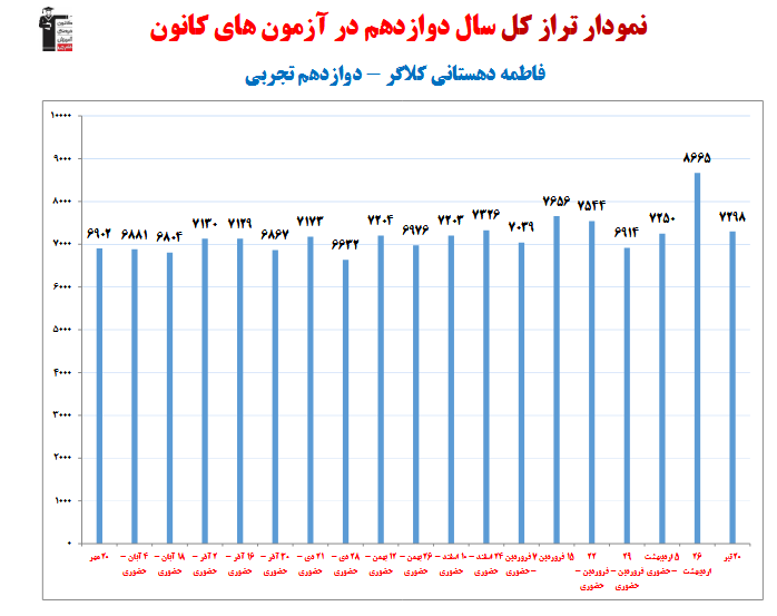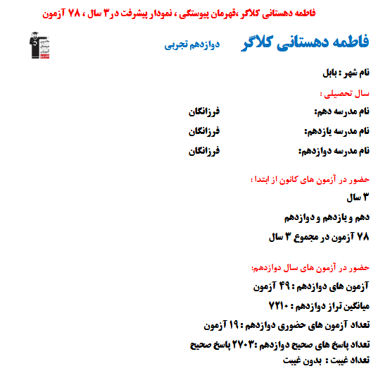 در ادامه میتوانید عملکرد درسی فاطمه دهستانی را در کانون مشاهده کنید. نمودار پیشرفت میانگین تراز در پایههای مختلف، نمودار تراز کل، عملکرد آزمونهای سال دوازدهم و شروع از تابستان و تراز آزمون های تابستان، کارنامههای مبحثی در نمودارها و تصاویر زیر قابل مشاهده است.