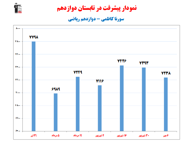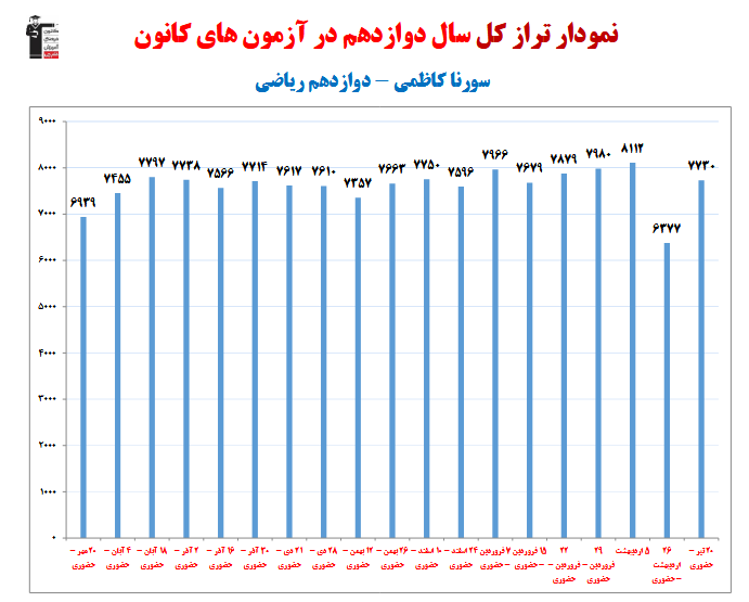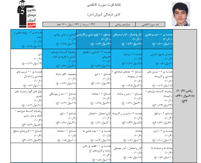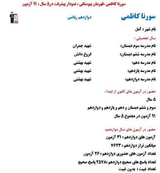 در ادامه میتوانید عملکرد درسی سورنا کاظمی را در کانون مشاهده کنید.نمودار پیشرفت میانگین تراز در پایههای مختلف، نمودار تراز کل، عملکرد آزمونهای سال دوازدهم و شروع از تابستان و تراز آزمون های تابستان، کارنامههای مبحثی در نمودارها و تصاویر زیر قابل مشاهده است.