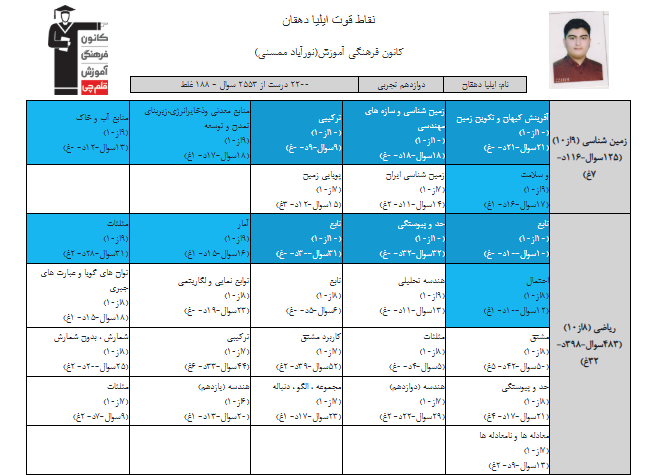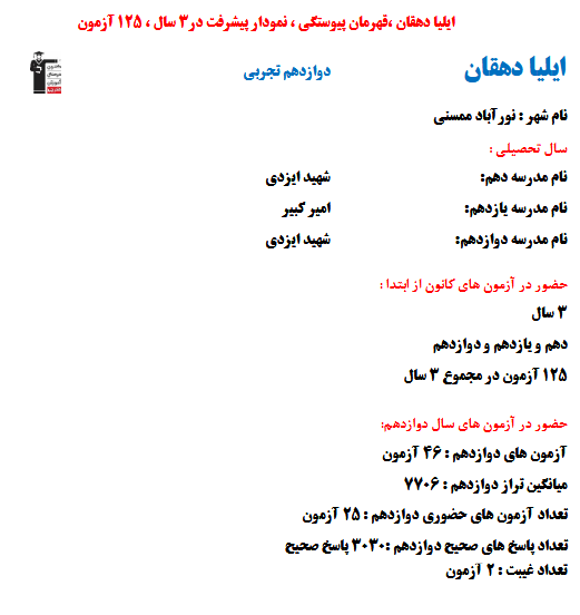 در ادامه میتوانید عملکرد درسی ایلیا دهقان را در کانون مشاهده کنید.نمودار پیشرفت میانگین تراز در پایههای مختلف، نمودار تراز کل، عملکرد آزمونهای سال دوازدهم و شروع از تابستان و تراز آزمون های تابستان، کارنامههای مبحثی در نمودارها و تصاویر زیر قابل مشاهده است.