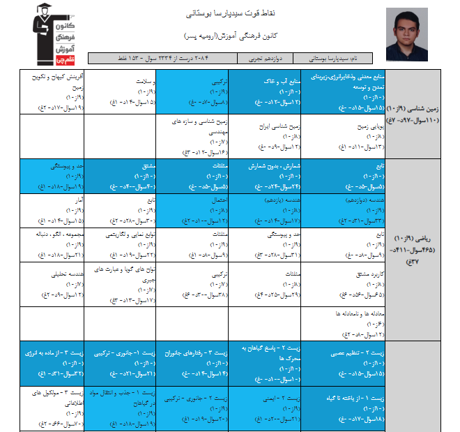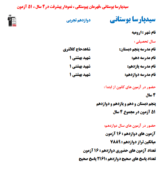 در ادامه میتوانید عملکرد درسی سید پارسا بوستانی را در کانون مشاهده کنید.نمودار پیشرفت میانگین تراز در پایههای مختلف، نمودار تراز کل، عملکرد آزمونهای سال دوازدهم ، کارنامههای مبحثی در نمودارها و تصاویر زیر قابل مشاهده است.