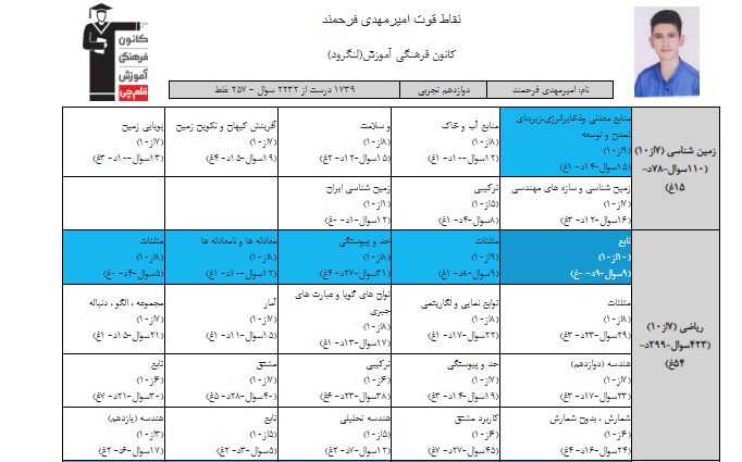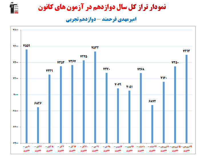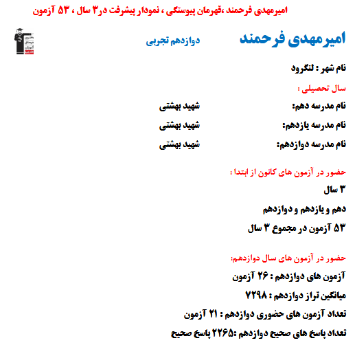 در ادامه میتوانید عملکرد درسی امیرمهدی فرحمند را در کانون مشاهده کنید.نمودار پیشرفت میانگین تراز در پایههای مختلف، نمودار تراز کل، عملکرد آزمونهای سال دوازدهم و شروع از تابستان و تراز آزمون های تابستان، کارنامههای مبحثی در نمودارها و تصاویر زیر قابل مشاهده است.
