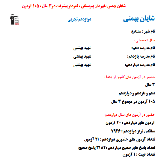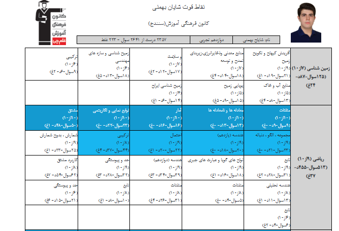 در ادامه میتوانید عملکرد درسی شایان بهمنی را در کانون مشاهده کنید.نمودار پیشرفت میانگین تراز در پایههای مختلف، نمودار تراز کل، عملکرد آزمونهای سال دوازدهم و شروع از تابستان و تراز آزمون های تابستان، کارنامههای مبحثی در نمودارها و تصاویر زیر قابل مشاهده است.