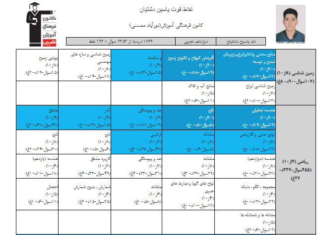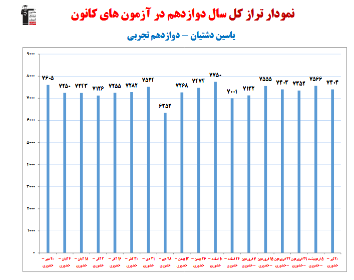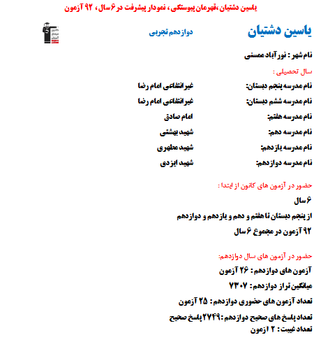 در ادامه میتوانید عملکرد درسی یاسین دشتیان را در کانون مشاهده کنید.نمودار پیشرفت میانگین تراز در پایههای مختلف، نمودار تراز کل، عملکرد آزمونهای سال دوازدهم و شروع از تابستان و تراز آزمون های تابستان، کارنامههای مبحثی در نمودارها و تصاویر زیر قابل مشاهده است.