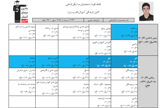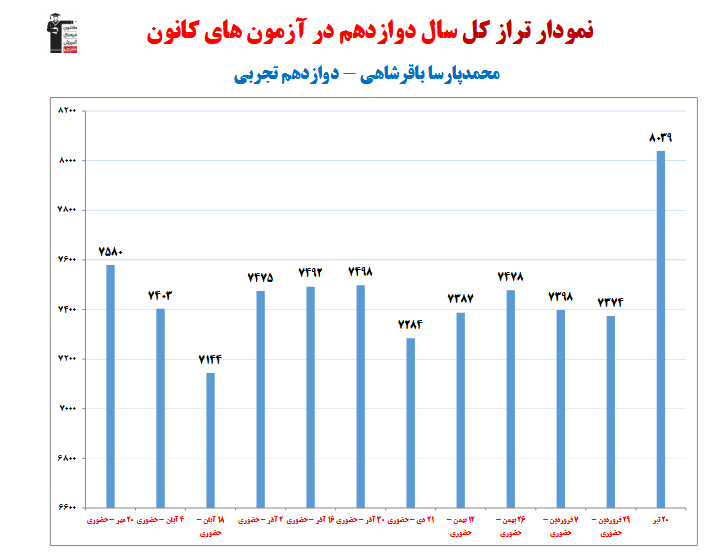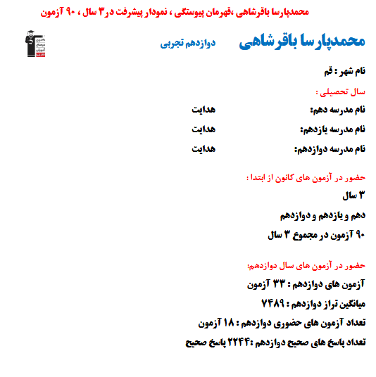 در ادامه میتوانید عملکرد درسی محمد پارسا باقرشاهی را در کانون مشاهده کنید.نمودار پیشرفت میانگین تراز در پایههای مختلف، نمودار تراز کل، عملکرد آزمونهای سال دوازدهم و شروع از تابستان و تراز آزمون های تابستان، کارنامههای مبحثی در نمودارها و تصاویر زیر قابل مشاهده است.