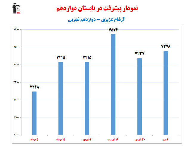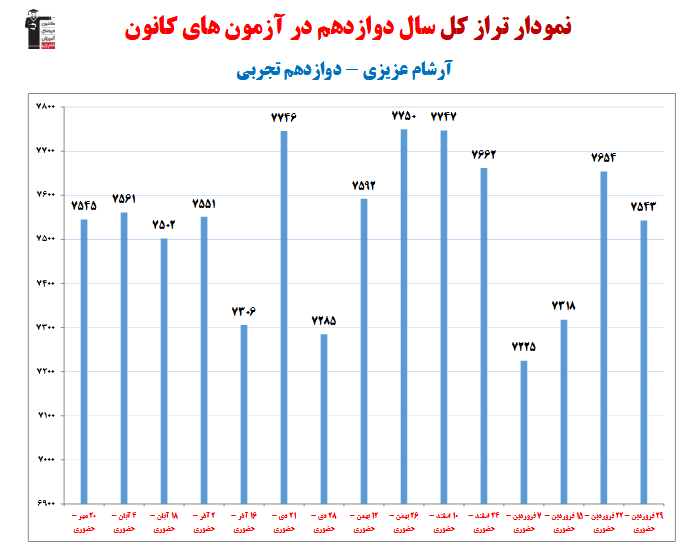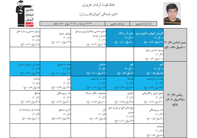 در ادامه میتوانید عملکرد درسی آرشام عزیزی را در کانون مشاهده کنید.نمودار پیشرفت میانگین تراز در پایههای مختلف، نمودار تراز کل، عملکرد آزمونهای سال دوازدهم و شروع از تابستان و تراز آزمون های تابستان، کارنامههای مبحثی در نمودارها و تصاویر زیر قابل مشاهده است.