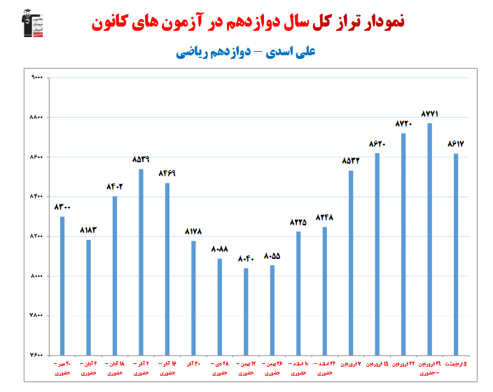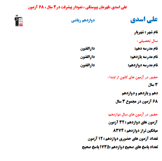 در ادامه میتوانید عملکرد درسی علی اسدی را در کانون مشاهده کنید.نمودار پیشرفت میانگین تراز در پایههای مختلف، نمودار تراز کل، عملکرد آزمونهای سال دوازدهم، کارنامههای مبحثی در نمودارها و تصاویر زیر قابل مشاهده است.