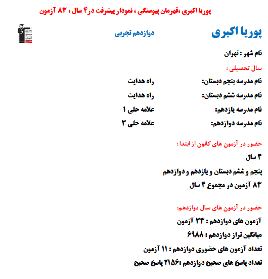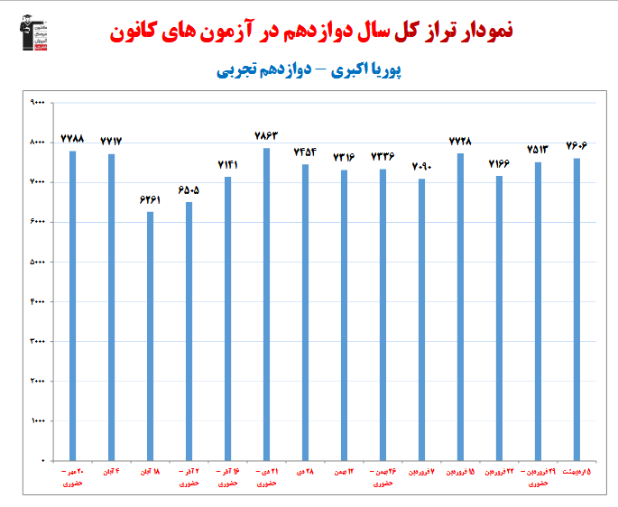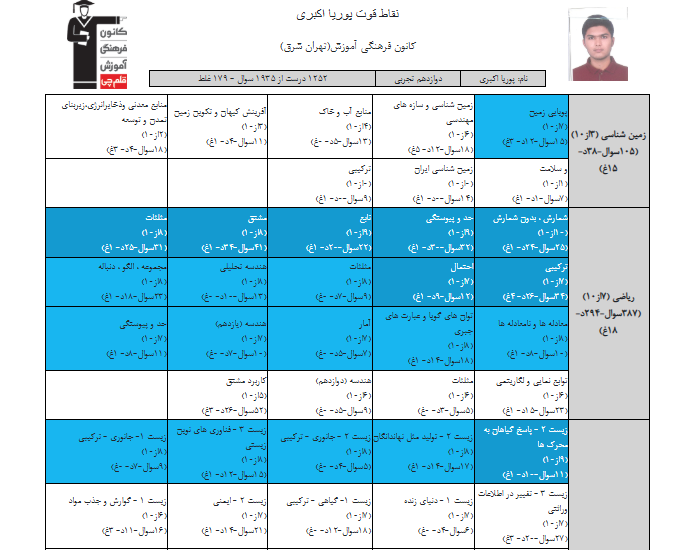 در ادامه میتوانید عملکرد درسی پوریا اکبری را در کانون مشاهده کنید.نمودار پیشرفت میانگین تراز در پایههای مختلف، نمودار تراز کل، عملکرد آزمونهای سال دوازدهم و شروع از تابستان و تراز آزمون های تابستان، کارنامههای مبحثی در نمودارها و تصاویر زیر قابل مشاهده است.