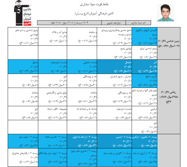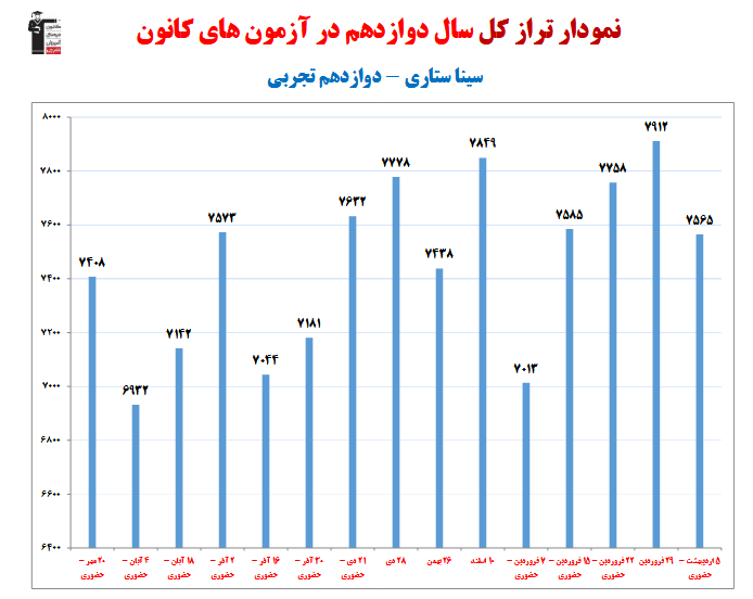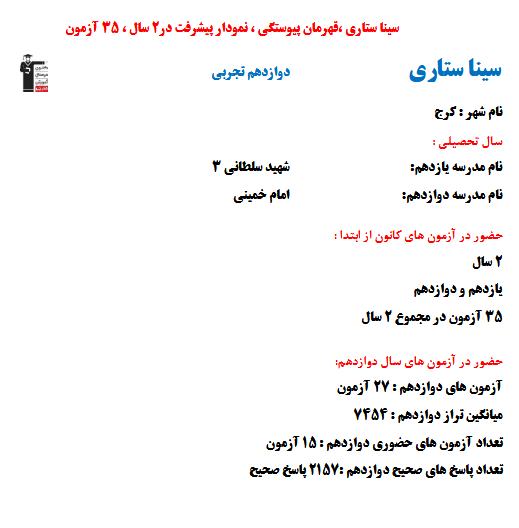 در ادامه میتوانید عملکرد درسی سینا ستاری را در کانون مشاهده کنید.نمودار پیشرفت میانگین تراز در پایههای مختلف، نمودار تراز کل، عملکرد آزمونهای سال دوازدهم و شروع از تابستان و تراز آزمون های تابستان، کارنامههای مبحثی در نمودارها و تصاویر زیر قابل مشاهده است.