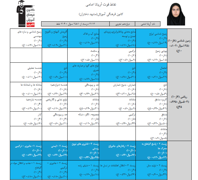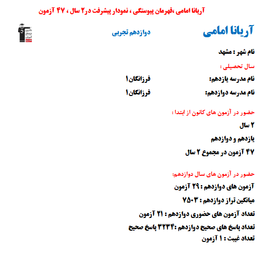 در ادامه میتوانید عملکرد درسی آریانا امامی را در کانون مشاهده کنید.نمودار پیشرفت میانگین تراز در پایههای مختلف، نمودار تراز کل، عملکرد آزمونهای سال دوازدهم و شروع از تابستان و تراز آزمون های تابستان، کارنامههای مبحثی در نمودارها و تصاویر زیر قابل مشاهده است.