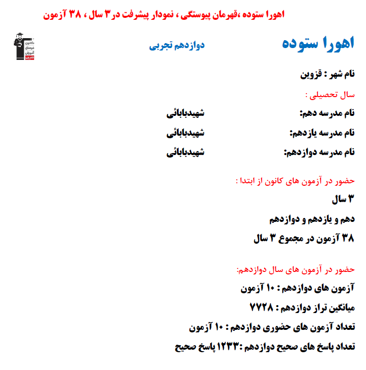 در ادامه میتوانید عملکرد درسی اهورا ستوده را در کانون مشاهده کنید.نمودار پیشرفت میانگین تراز در پایههای مختلف، نمودار تراز کل، عملکرد آزمونهای سال دوازدهم ، کارنامههای مبحثی در نمودارها و تصاویر زیر قابل مشاهده است.