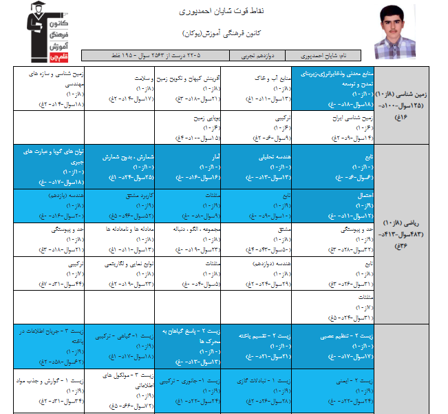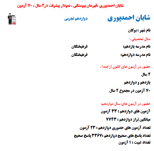 در ادامه میتوانید عملکرد درسی شایان احمدپوری را در کانون مشاهده کنید.نمودار پیشرفت میانگین تراز در پایههای مختلف، نمودار تراز کل، عملکرد آزمونهای سال دوازدهم و شروع از تابستان و تراز آزمون های تابستان، کارنامههای مبحثی در نمودارها و تصاویر زیر قابل مشاهده است.