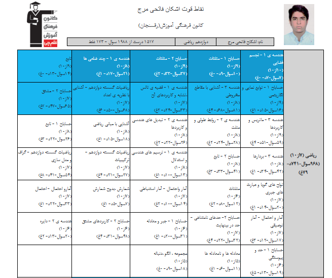 در ادامه میتوانید عملکرد درسی اشکان فاتحی را در کانون مشاهده کنید.نمودار پیشرفت میانگین تراز در پایههای مختلف، نمودار تراز کل، عملکرد آزمونهای سال دوازدهم و شروع از تابستان و تراز آزمون های تابستان، کارنامههای مبحثی در نمودارها و تصاویر زیر قابل مشاهده است.