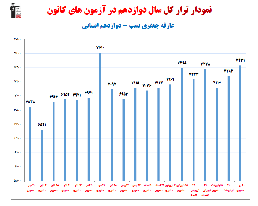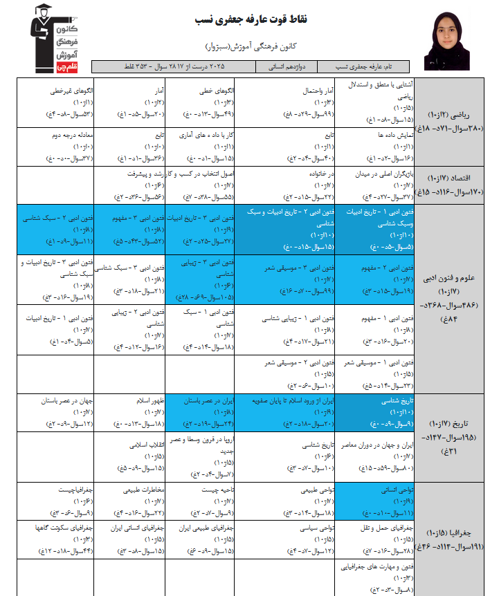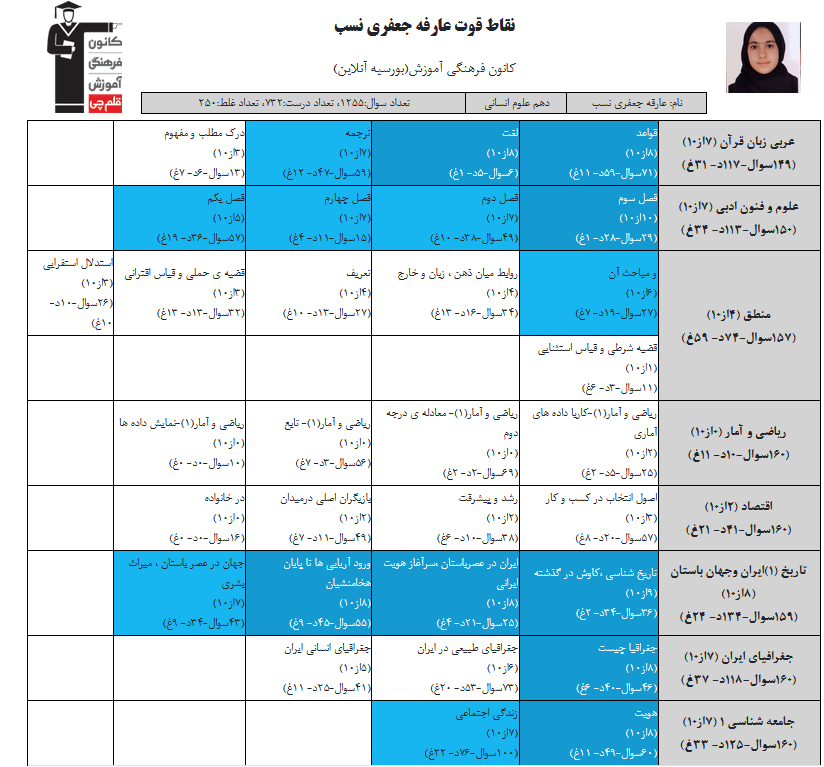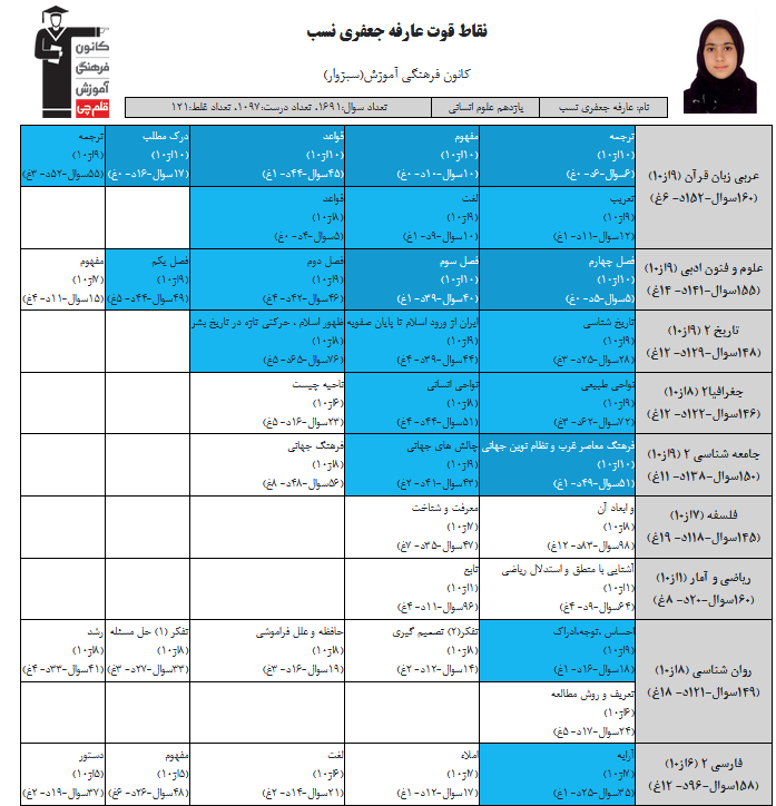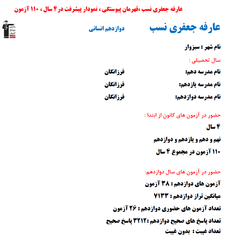 در ادامه میتوانید عملکرد درسی عارفه جعفرینسب را در کانون مشاهده کنید.نمودار پیشرفت میانگین تراز در پایههای مختلف، نمودار تراز کل، عملکرد آزمونهای سال دوازدهم و شروع از تابستان و تراز آزمون های تابستان، کارنامههای مبحثی در نمودارها و تصاویر زیر قابل مشاهده است.