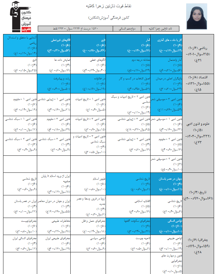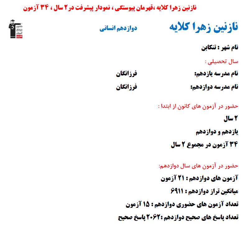 در ادامه میتوانید عملکرد درسی نازنین زهرا کلایه را در کانون مشاهده کنید.