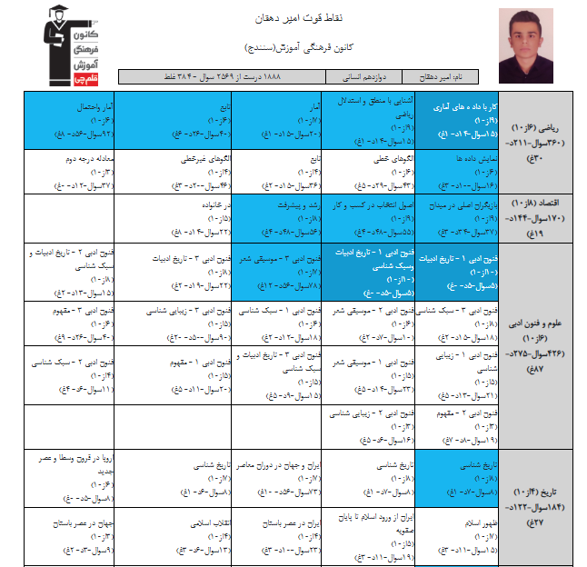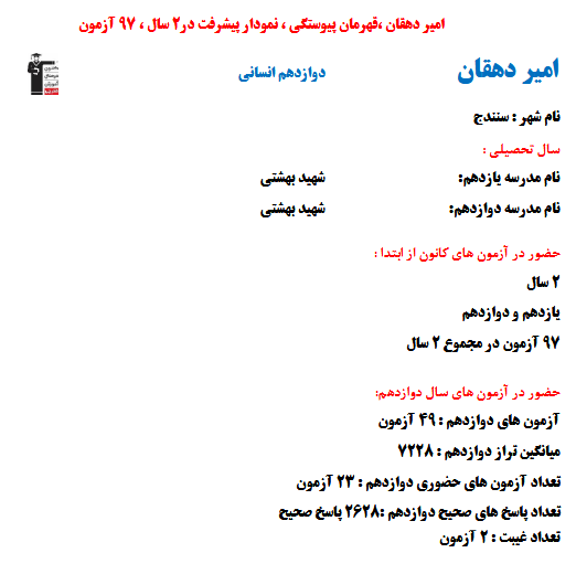 در ادامه میتوانید عملکرد درسی امیر دهقان را در کانون مشاهده کنید.نمودار پیشرفت میانگین تراز در پایههای مختلف، نمودار تراز کل، عملکرد آزمونهای سال دوازدهم و شروع از تابستان و تراز آزمون های تابستان، کارنامههای مبحثی در نمودارها و تصاویر زیر قابل مشاهده است.