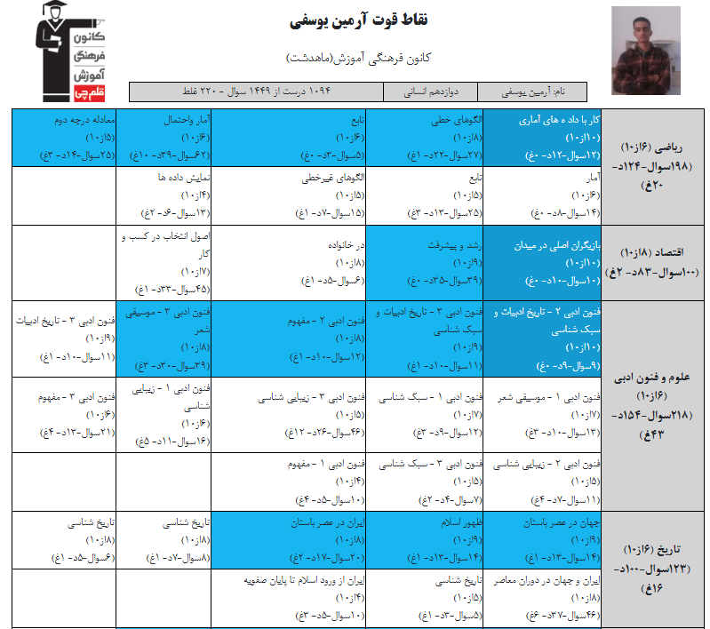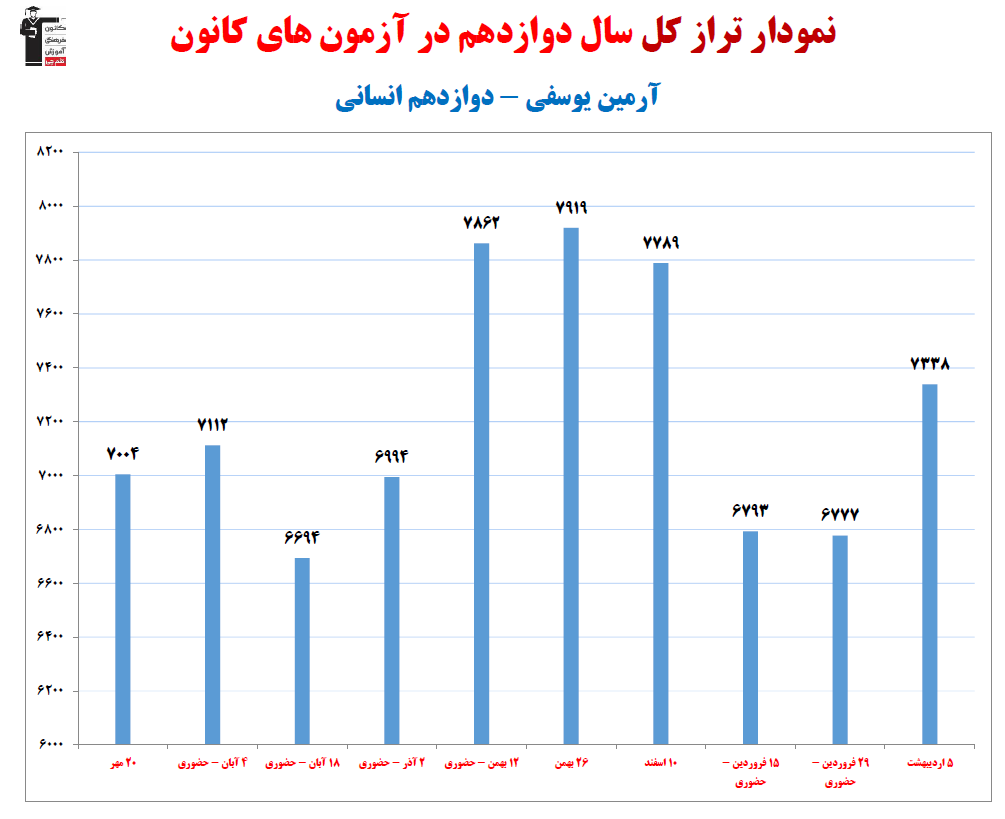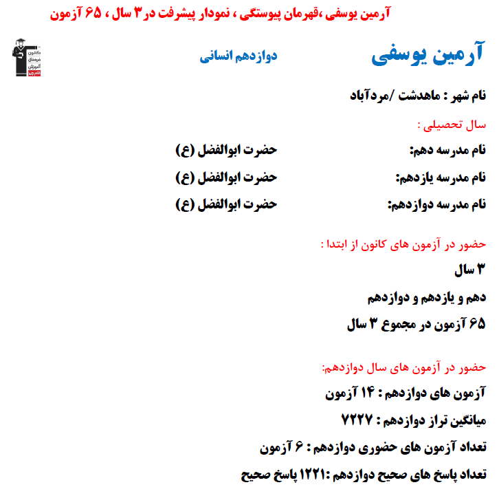 در ادامه میتوانید عملکرد درسی آرمین یوسفی را در کانون مشاهده کنید.نمودار پیشرفت میانگین تراز در پایههای مختلف، نمودار تراز کل، عملکرد آزمونهای سال دوازدهم، کارنامههای مبحثی در نمودارها و تصاویر زیر قابل مشاهده است.