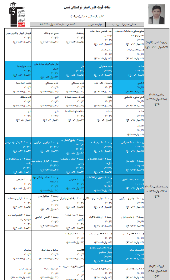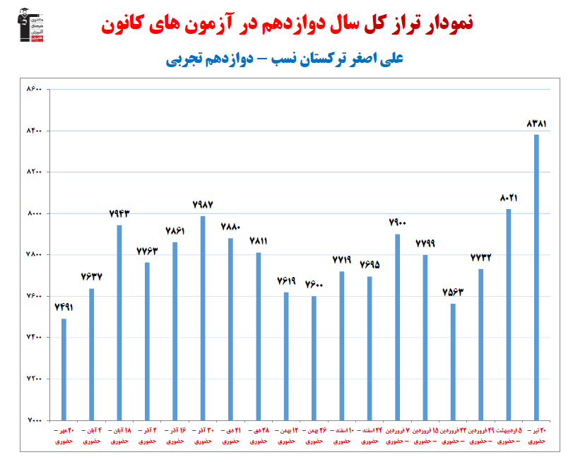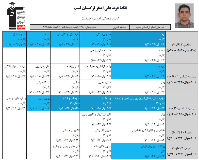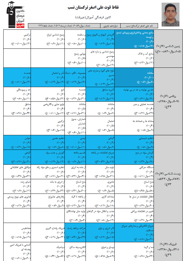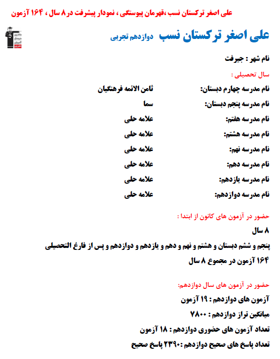 در ادامه میتوانید عملکرد درسی علیاصغر ترکستان نسب را در کانون مشاهده کنید.نمودار پیشرفت میانگین تراز در پایههای مختلف، نمودار تراز کل، عملکرد آزمونهای سال دوازدهم، کارنامههای مبحثی در نمودارها و تصاویر زیر قابل مشاهده است.