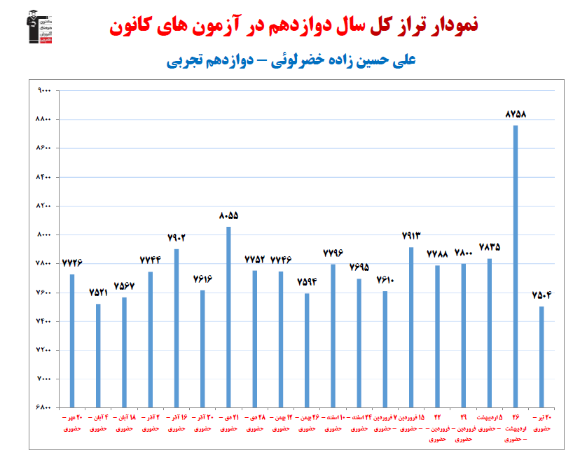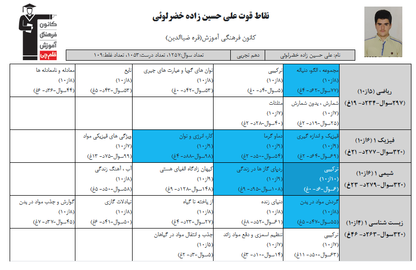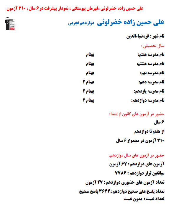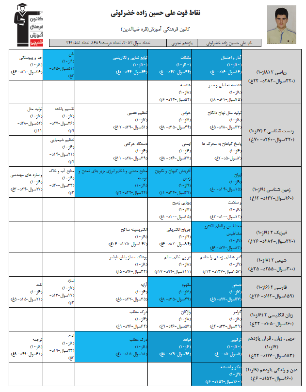 در ادامه میتوانید عملکرد درسی علی حسین زاده خضرلوئی را در کانون مشاهده کنید.نمودار پیشرفت میانگین تراز در پایههای مختلف، نمودار تراز کل، عملکرد آزمونهای سال دوازدهم و شروع از تابستان و تراز آزمون های تابستان، کارنامههای مبحثی در نمودارها و تصاویر زیر قابل مشاهده است.