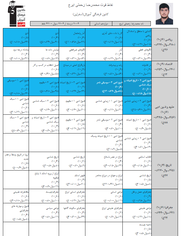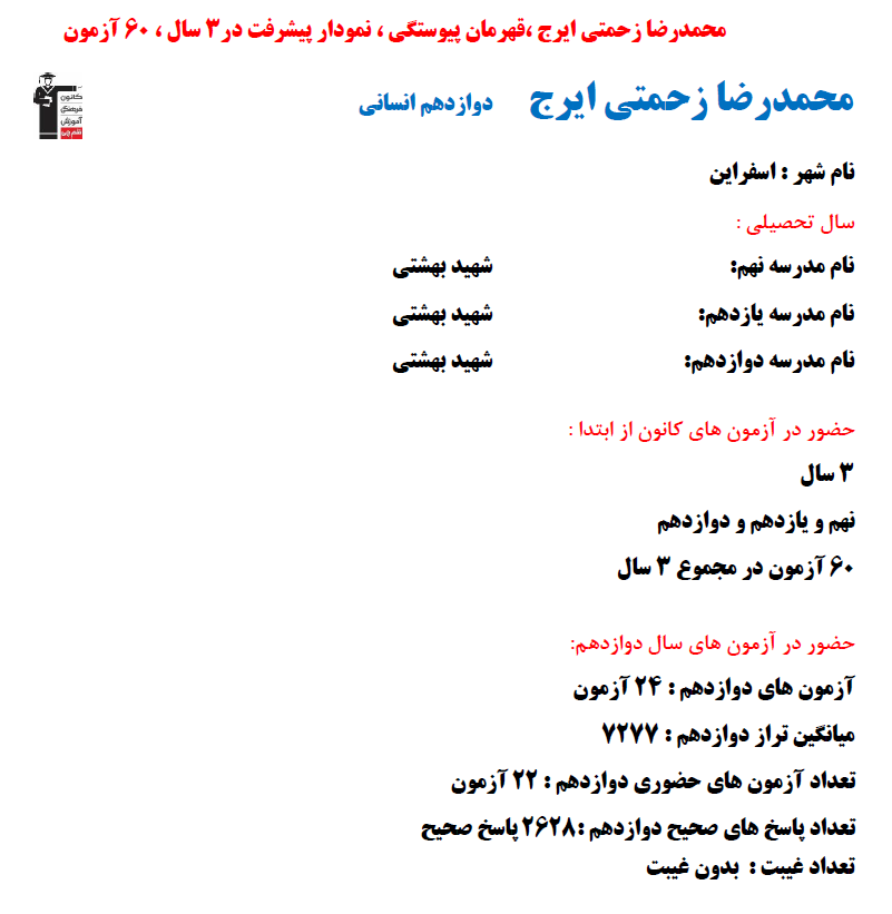 در ادامه میتوانید عملکرد درسی محمدرضا زحمتی ایرج را در کانون مشاهده کنید.