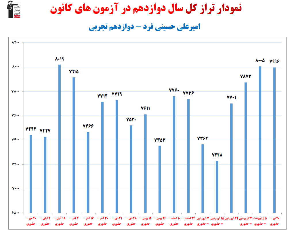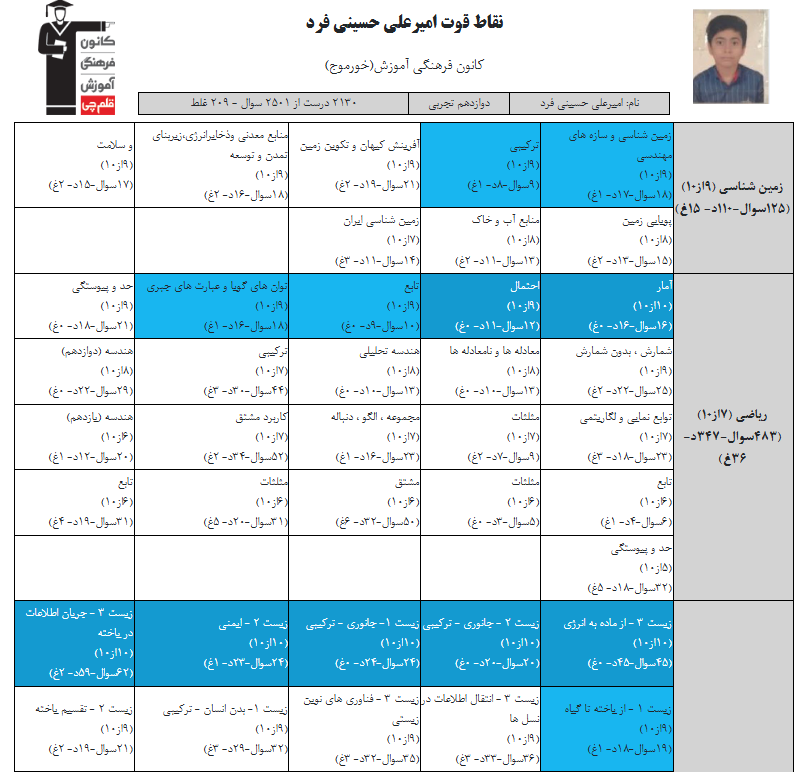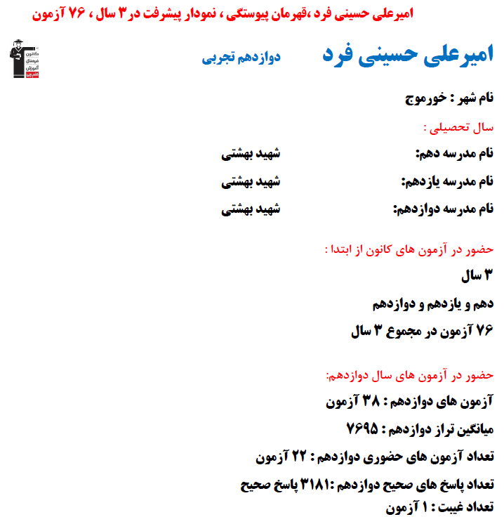 در ادامه میتوانید عملکرد درسی امیرعلی حسینی فرد را در کانون مشاهده کنید.نمودار پیشرفت میانگین تراز در پایههای مختلف، نمودار تراز کل، عملکرد آزمونهای سال دوازدهم و شروع از تابستان و تراز آزمون های تابستان، کارنامههای مبحثی در نمودارها و تصاویر زیر قابل مشاهده است.