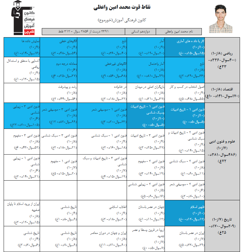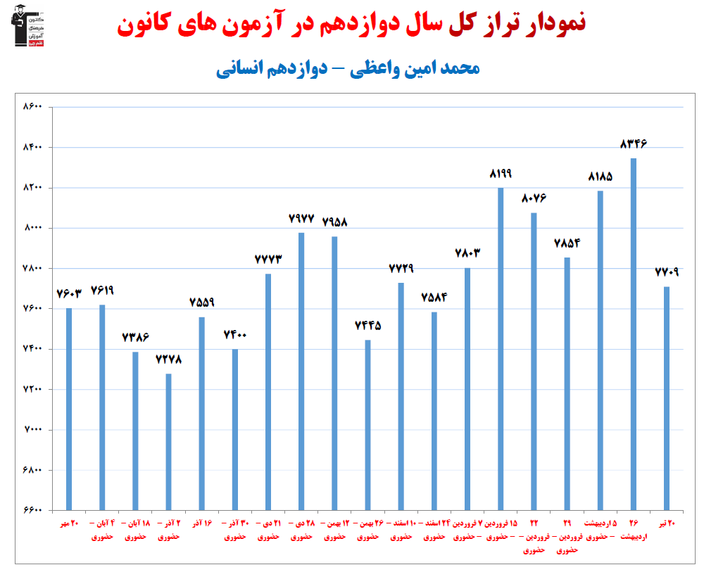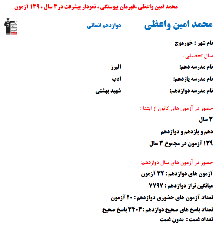 در ادامه میتوانید عملکرد درسی محمدامین واعظی را در کانون مشاهده کنید.نمودار پیشرفت میانگین تراز در پایههای مختلف، نمودار تراز کل، عملکرد آزمونهای سال دوازدهم و شروع از تابستان و تراز آزمون های تابستان، کارنامههای مبحثی در نمودارها و تصاویر زیر قابل مشاهده است.