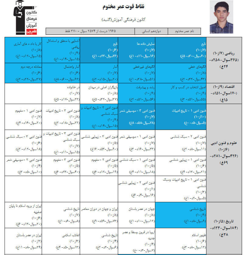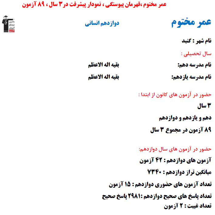 در ادامه میتوانید عملکرد درسی عمر مختوم را در کانون مشاهده کنید.نمودار پیشرفت میانگین تراز در پایههای مختلف، نمودار تراز کل، عملکرد آزمونهای سال دوازدهم و شروع از تابستان و تراز آزمون های تابستان، کارنامههای مبحثی در نمودارها و تصاویر زیر قابل مشاهده است.