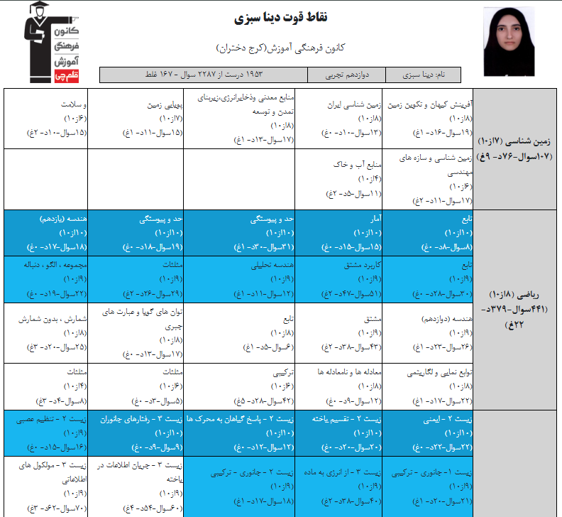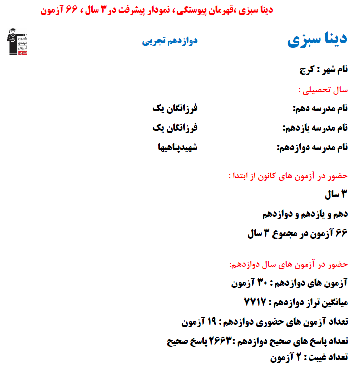در ادامه میتوانید عملکرد درسی دینا سبزی را در کانون مشاهده کنید.نمودار پیشرفت میانگین تراز در پایههای مختلف، نمودار تراز کل، عملکرد آزمونهای سال دوازدهم و شروع از تابستان و تراز آزمون های تابستان، کارنامههای مبحثی در نمودارها و تصاویر زیر قابل مشاهده است.