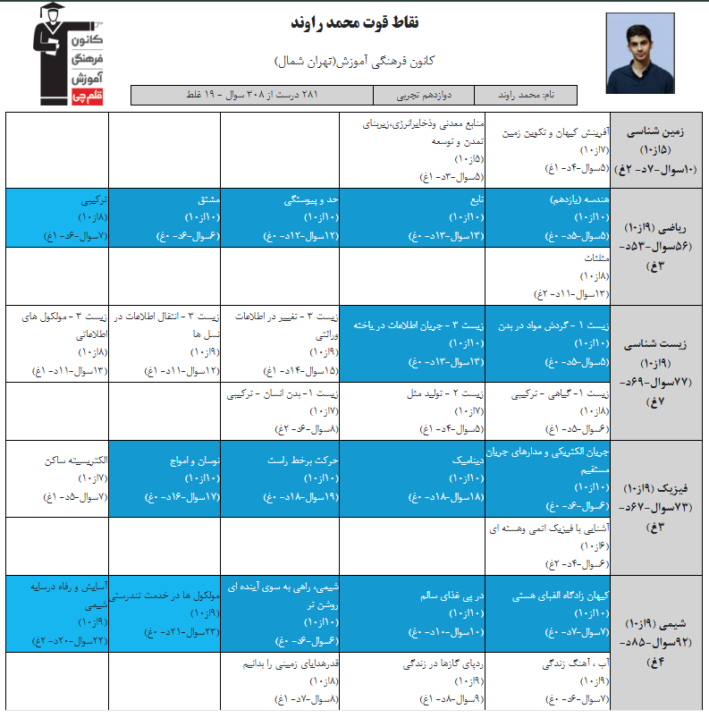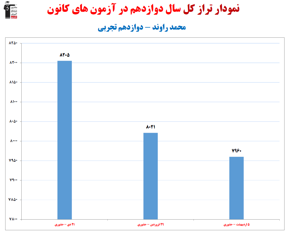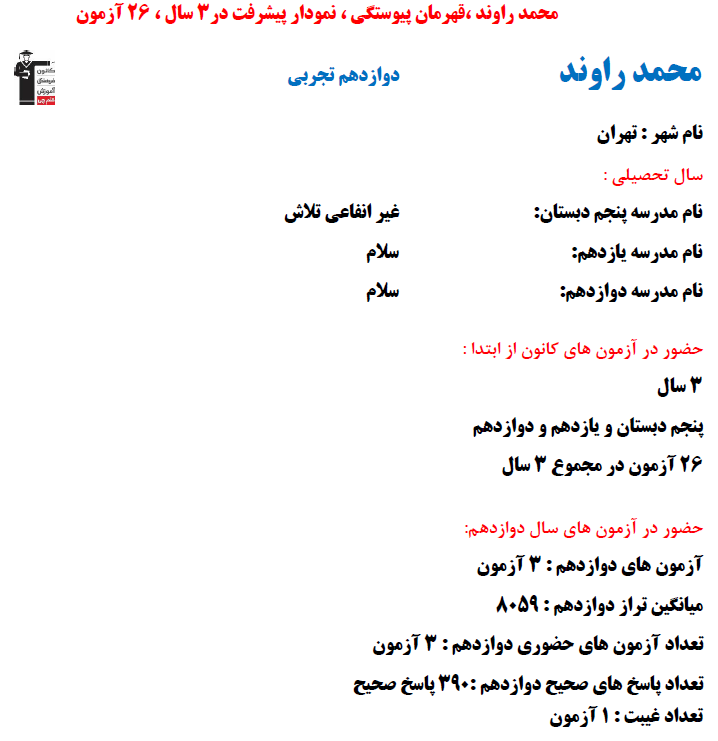 در ادامه میتوانید عملکرد درسی محمد راوند را در کانون مشاهده کنید.نمودار پیشرفت میانگین تراز در پایههای مختلف، نمودار تراز کل، عملکرد آزمونهای سال دوازدهم، کارنامههای مبحثی در نمودارها و تصاویر زیر قابل مشاهده است.