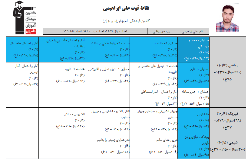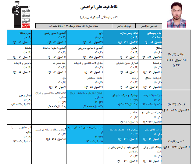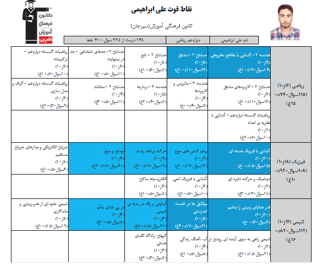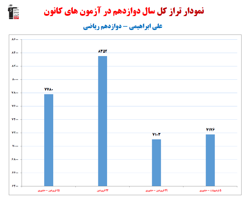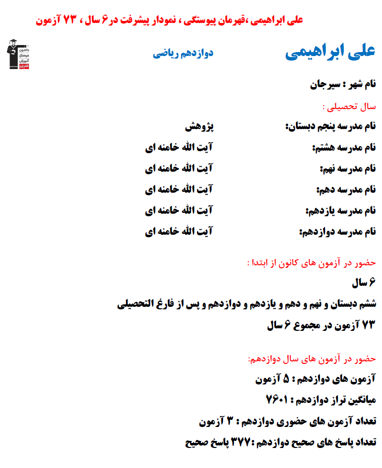 در ادامه میتوانید عملکرد درسی علی ابراهیمی را در کانون مشاهده کنید.نمودار پیشرفت میانگین تراز در پایههای مختلف، نمودار تراز کل، عملکرد آزمونهای سال دوازدهم، کارنامههای مبحثی در نمودارها و تصاویر زیر قابل مشاهده است.