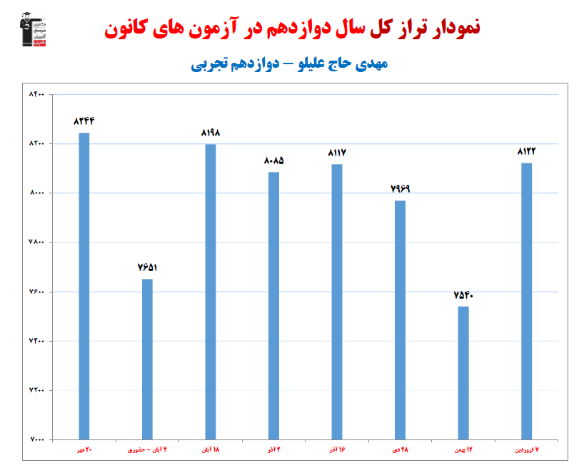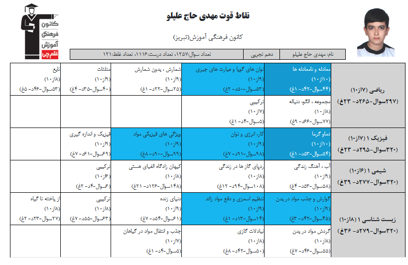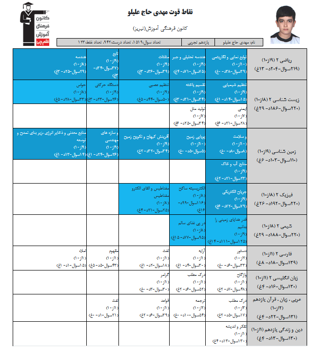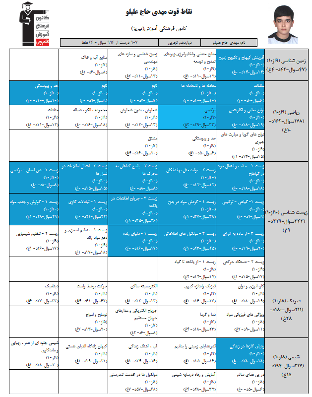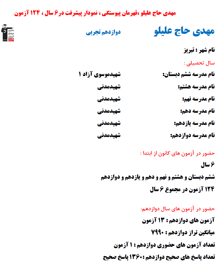 در ادامه میتوانید عملکرد درسی مهدی حاج علیلو را در کانون مشاهده کنید.نمودار پیشرفت میانگین تراز در پایههای مختلف، نمودار تراز کل، عملکرد آزمونهای سال دوازدهم و شروع از تابستان و تراز آزمون های تابستان، کارنامههای مبحثی در نمودارها و تصاویر زیر قابل مشاهده است.
