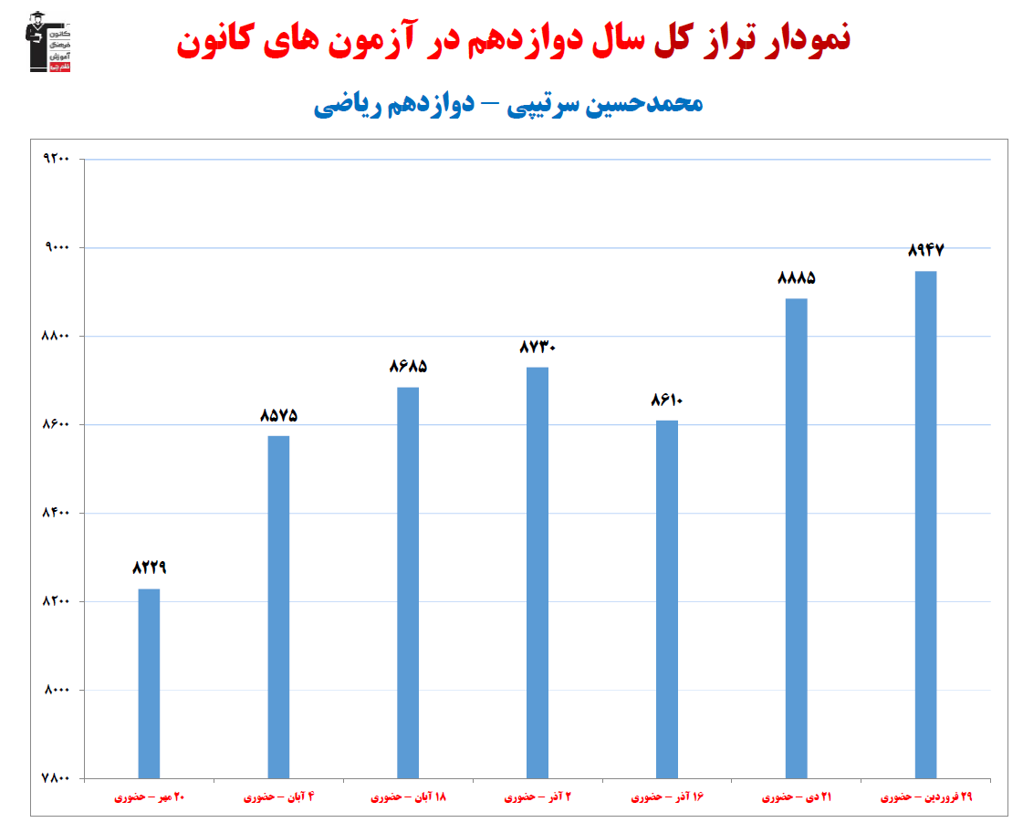 محمدحسین سرتیپی؛ نمودار پیشرفت در 2سال، 9 آزمون، 776پاسخ صحیح