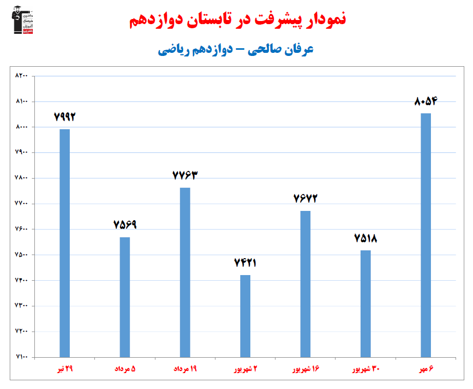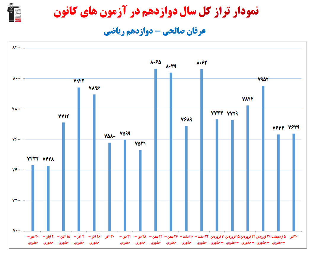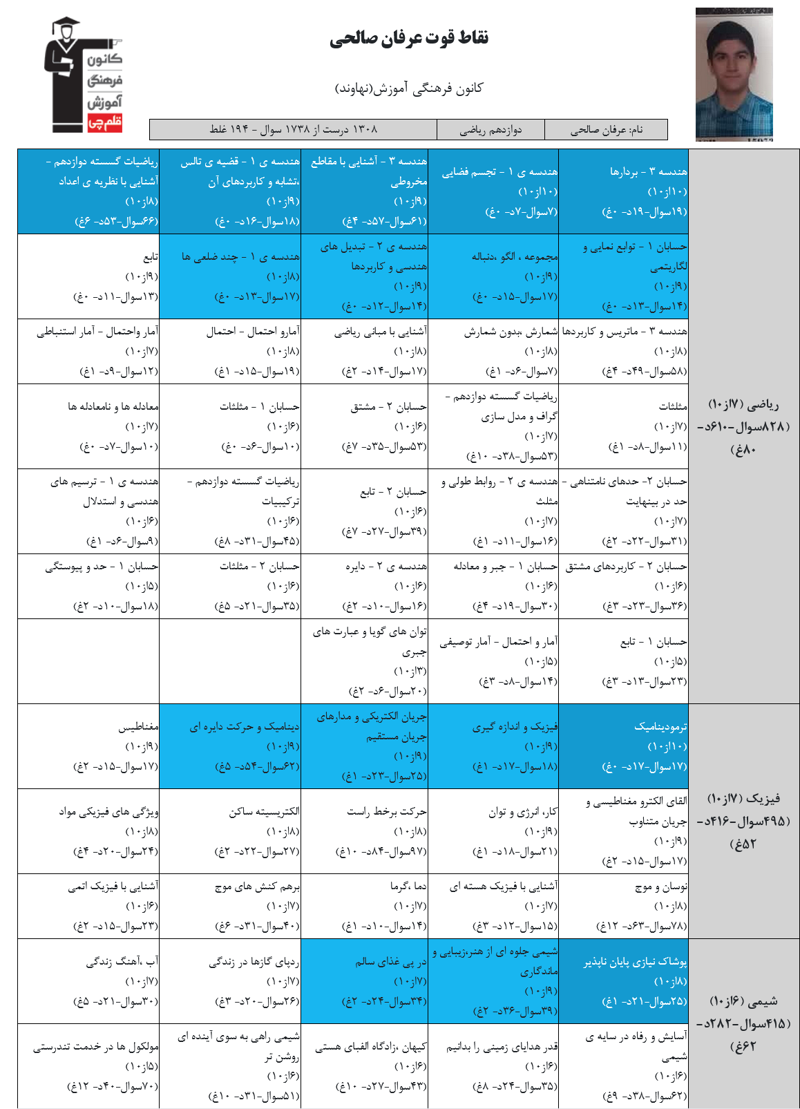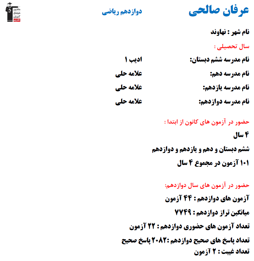 در ادامه میتوانید عملکرد درسی عرفان صالحي را در کانون مشاهده کنید.نمودار پیشرفت میانگین تراز در پایههای مختلف، نمودار تراز کل، عملکرد آزمونهای سال دوازدهم و شروع از تابستان و تراز آزمون های تابستان، کارنامههای مبحثی در نمودارها و تصاویر زیر قابل مشاهده است.