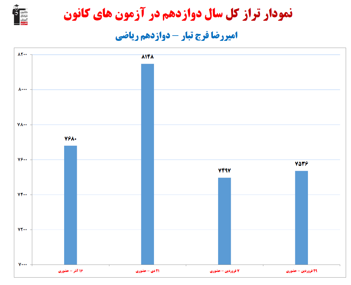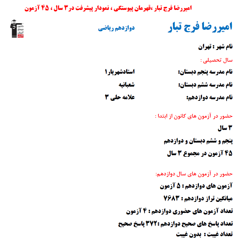 در ادامه میتوانید عملکرد درسی امیررضا فرج تبار را در کانون مشاهده کنید. نمودار پیشرفت میانگین تراز در پایههای مختلف، نمودار تراز کل، کارنامههای مبحثی در نمودارها و تصاویر زیر قابل مشاهده است.