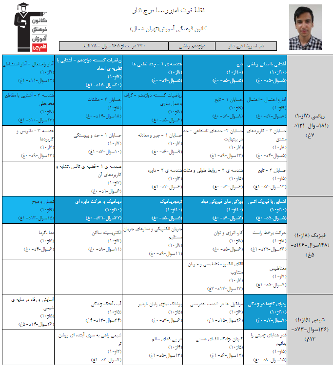در ادامه میتوانید عملکرد درسی امیررضا فرج تبار را در کانون مشاهده کنید.