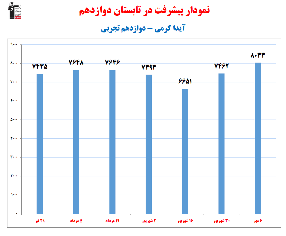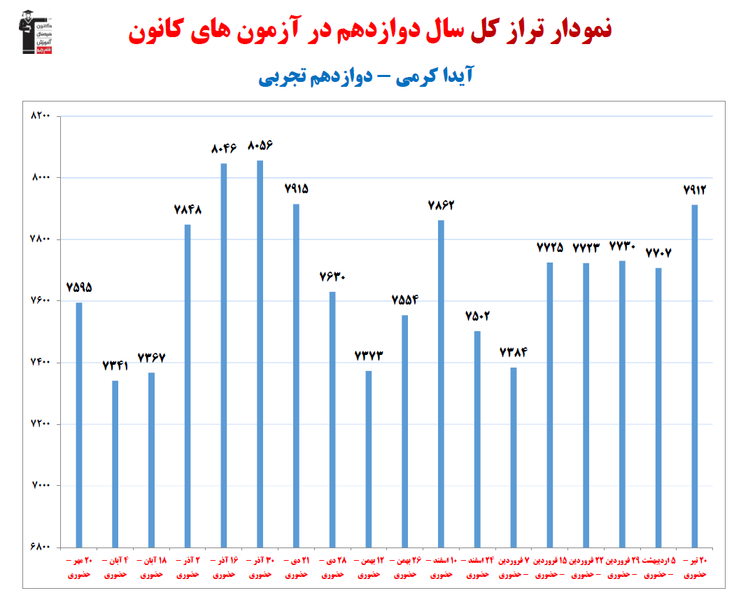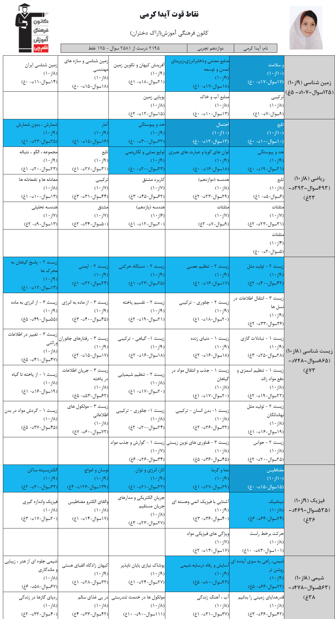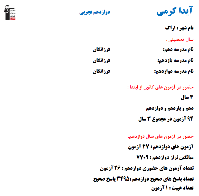 در ادامه میتوانید عملکرد درسی آيدا کرمي را در کانون مشاهده کنید.نمودار پیشرفت میانگین تراز در پایههای مختلف، نمودار تراز کل، عملکرد آزمونهای سال دوازدهم و شروع از تابستان و تراز آزمون های تابستان، کارنامههای مبحثی در نمودارها و تصاویر زیر قابل مشاهده است.